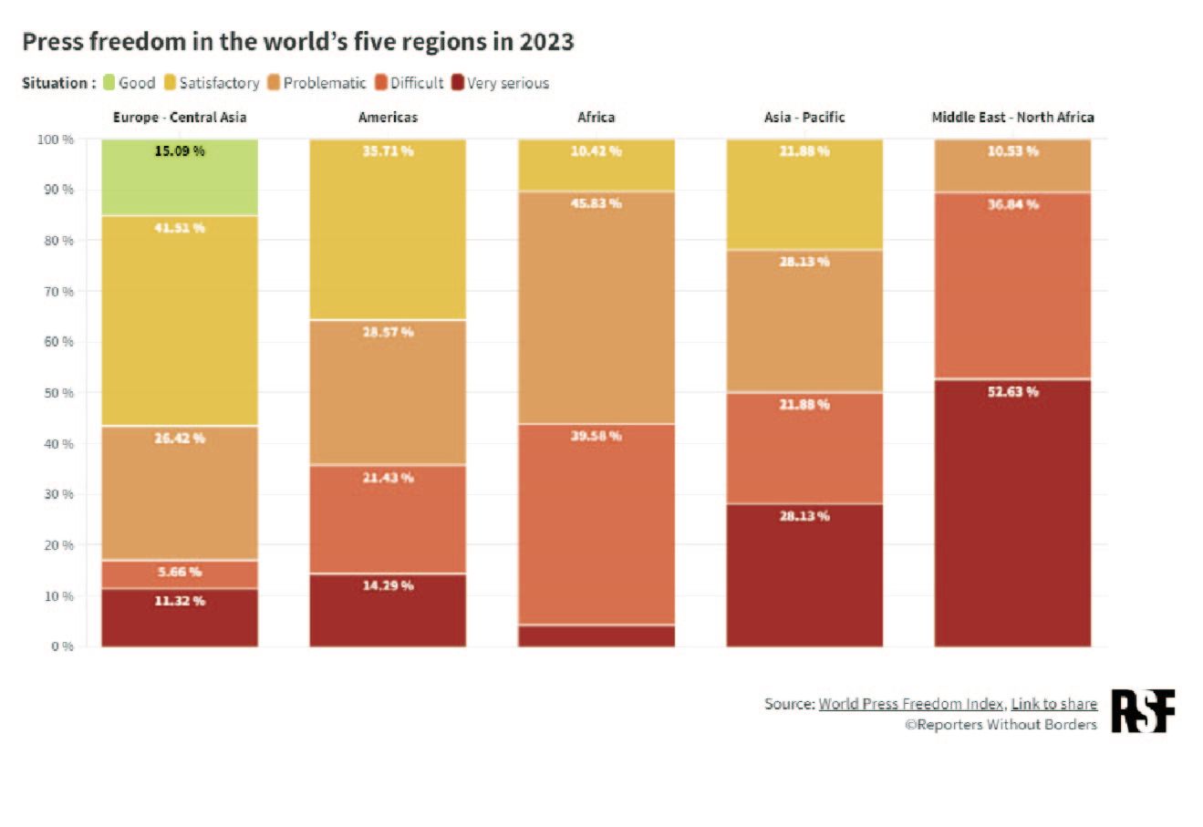 無國界記者組織發表世界各國的新聞自由指數,地圖中顏色分別代表:綠色-狀況良好;黃色-狀況尚可;淺橘色-問題顯著;深橘色-狀況艱難;紅色-狀況惡劣。