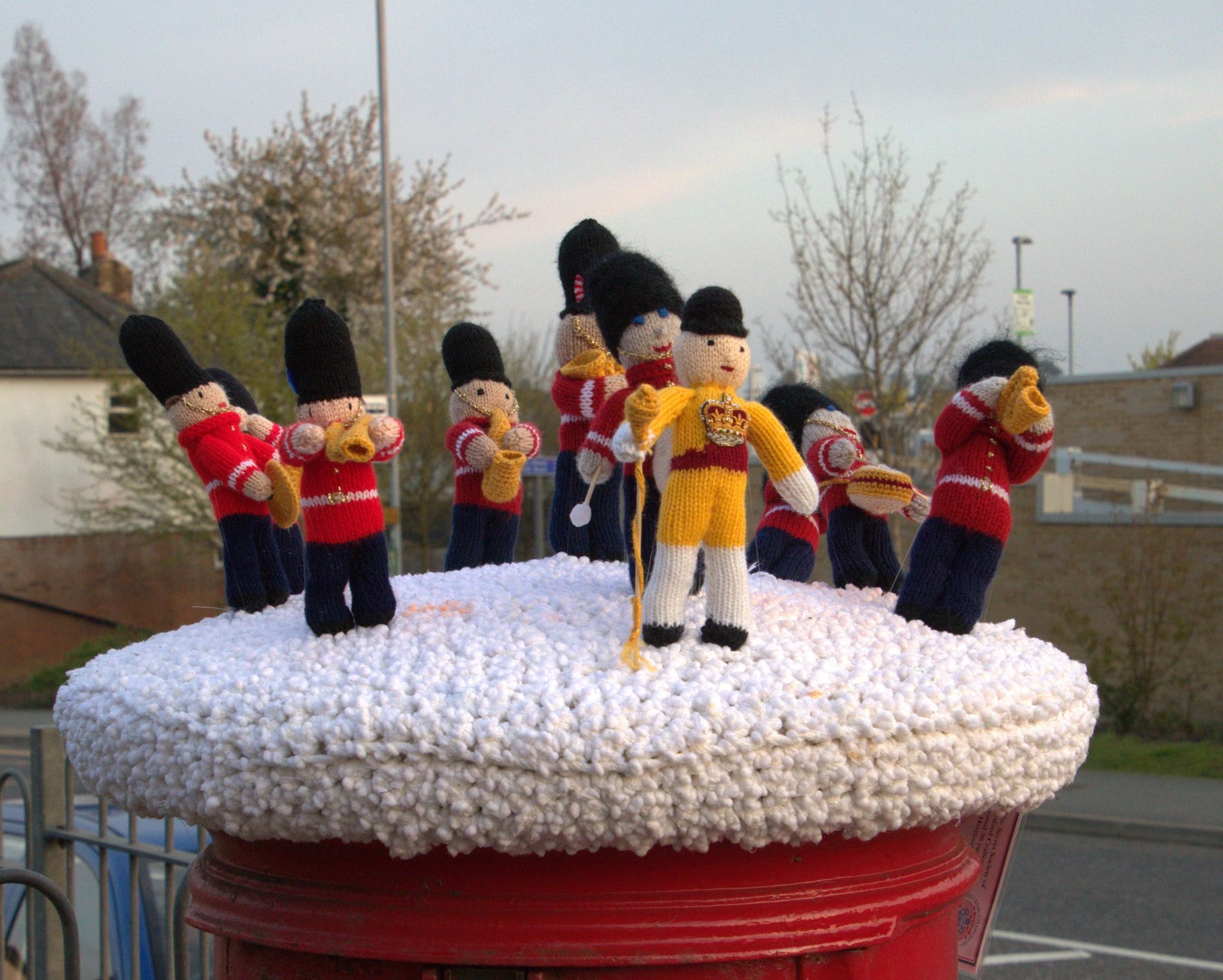 紅色郵筒上,一群針織英國衛兵拿著小鼓、小號等樂器,迎接新王登基。