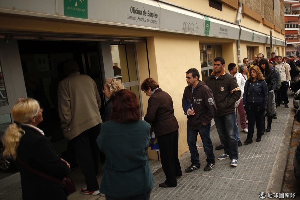 照片中是西班牙當地正在職業介紹所外排隊的人們。