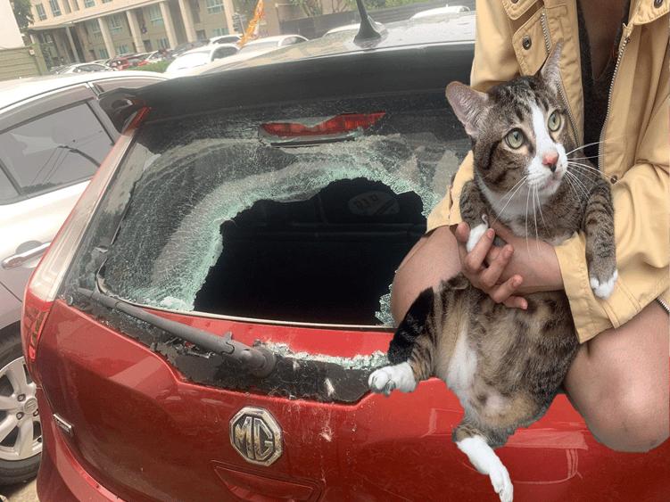 據《The Thaiger》報導,目擊者看到一隻貓不慎從6樓陽台摔出,幸好牠在3樓時及時抓住一個網子,隨後才摔到車子上。當管理員趕到現場後,發現車子旁都是玻璃碎片,那隻虎斑貓則是「一臉天真」的躲在車底下。