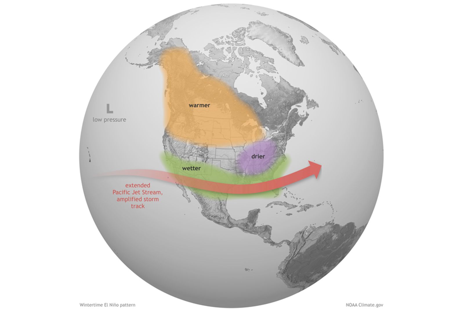 通常秋季和冬季期間,中等到強烈的聖嬰現象會導致從南加州到墨西哥灣沿岸的天氣比平均水平潮濕,而太平洋西北部和俄亥俄河谷的天氣比平均水平乾燥,其實通常當聖嬰現象出現時,大西洋颶風的活動會被抑制,但是太平洋中部與東部海盆海域將會生成強烈颱風