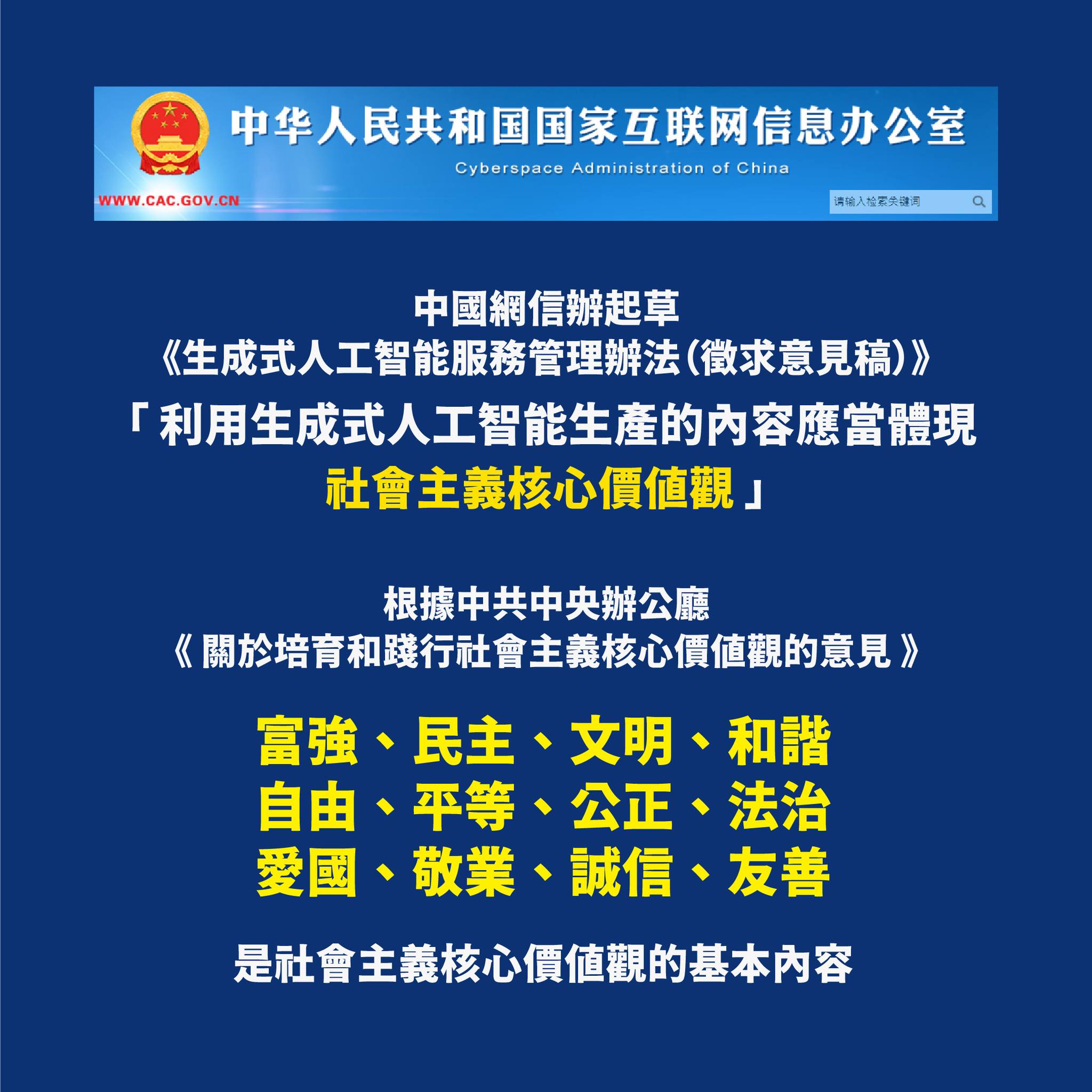4/11,中國國家互聯網信息辦公室以促進生成式人工智能技術健康發展和規範應用為由,公布了《生成式人工智能服務管理辦法(徵求意見稿)》,草擬了21條規定,向大眾布告並公開徵求意見。