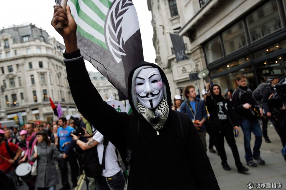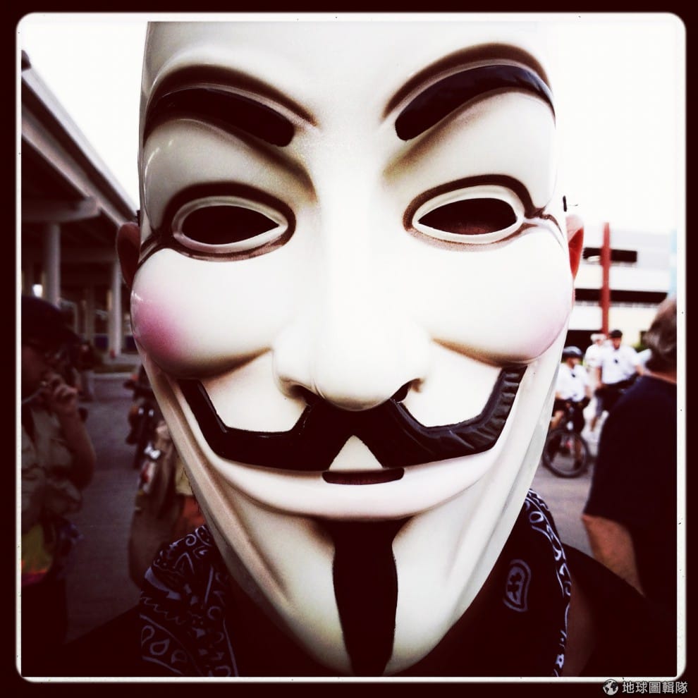 照片中的面具,有沒有印象了?這有著腮紅的白臉、加上一對翹到不行的彎鬍子,就是大家很熟的「V怪客」模樣,他的靈感就是來自「蓋依佛克斯」!早期沒有甚麼名氣的這個肖像,因為電影的關係變成家喻戶曉的象徵!圖片來源:Warrick Page/Getty Images