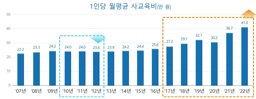 根據南韓政府統計,韓國學生花費在補習班的支出逐年增加,2022年更是創下新高,平均一個學生每月需花費41萬韓元的補習費。