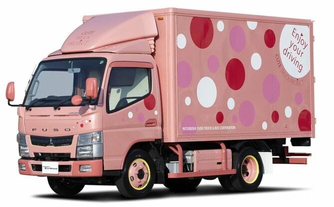 用著粉紅色的可愛字體寫著「能為現場增添華麗光輝的女性卡車司機正在增加」,甚至還設計一台宣稱是為女性而開發的、由女性為女性營運,塗有圓點的粉紅色卡車。