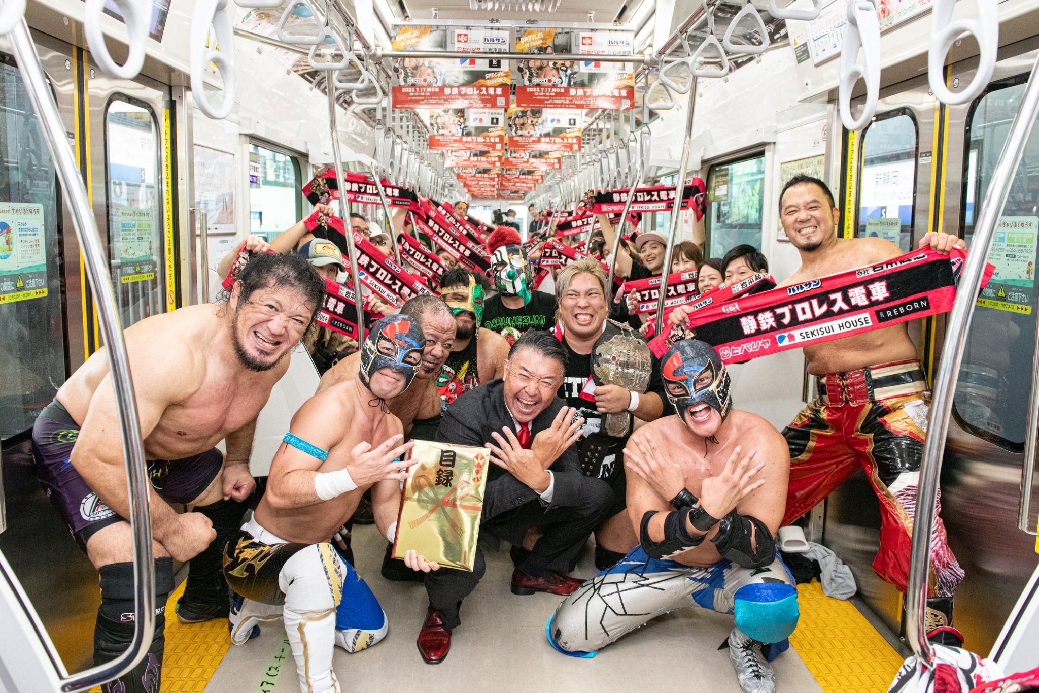 17日午後,往返於新靜岡站與新清水站之間的列車駛離月台,激烈的摔角比賽也在車廂內展開。這是靜岡鐵路首次舉辦「電車摔角」活動,他們與職業摔角公司「FREEDOMS」合作,邀請四組雙打隊伍參賽,藉此推廣靜岡鐵道。