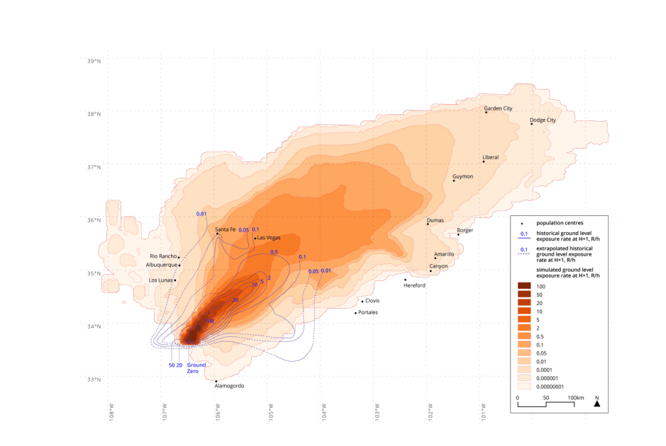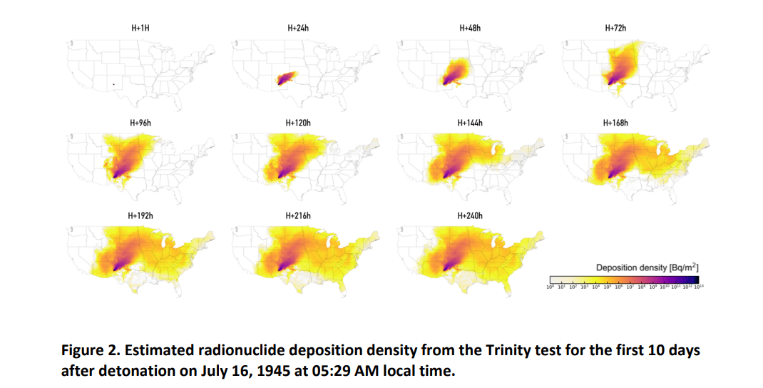 研究人員模擬當時的氣候狀況,繪製三位一體試驗過後,周邊地區降塵沉積的狀況。