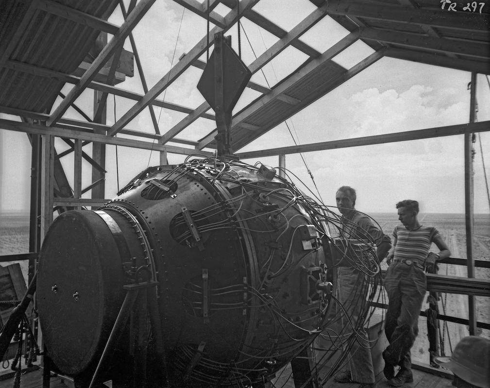 曼哈頓計畫的人員透過吊車,將原子彈「小工具」(The Gadget)安裝在高塔頂端。