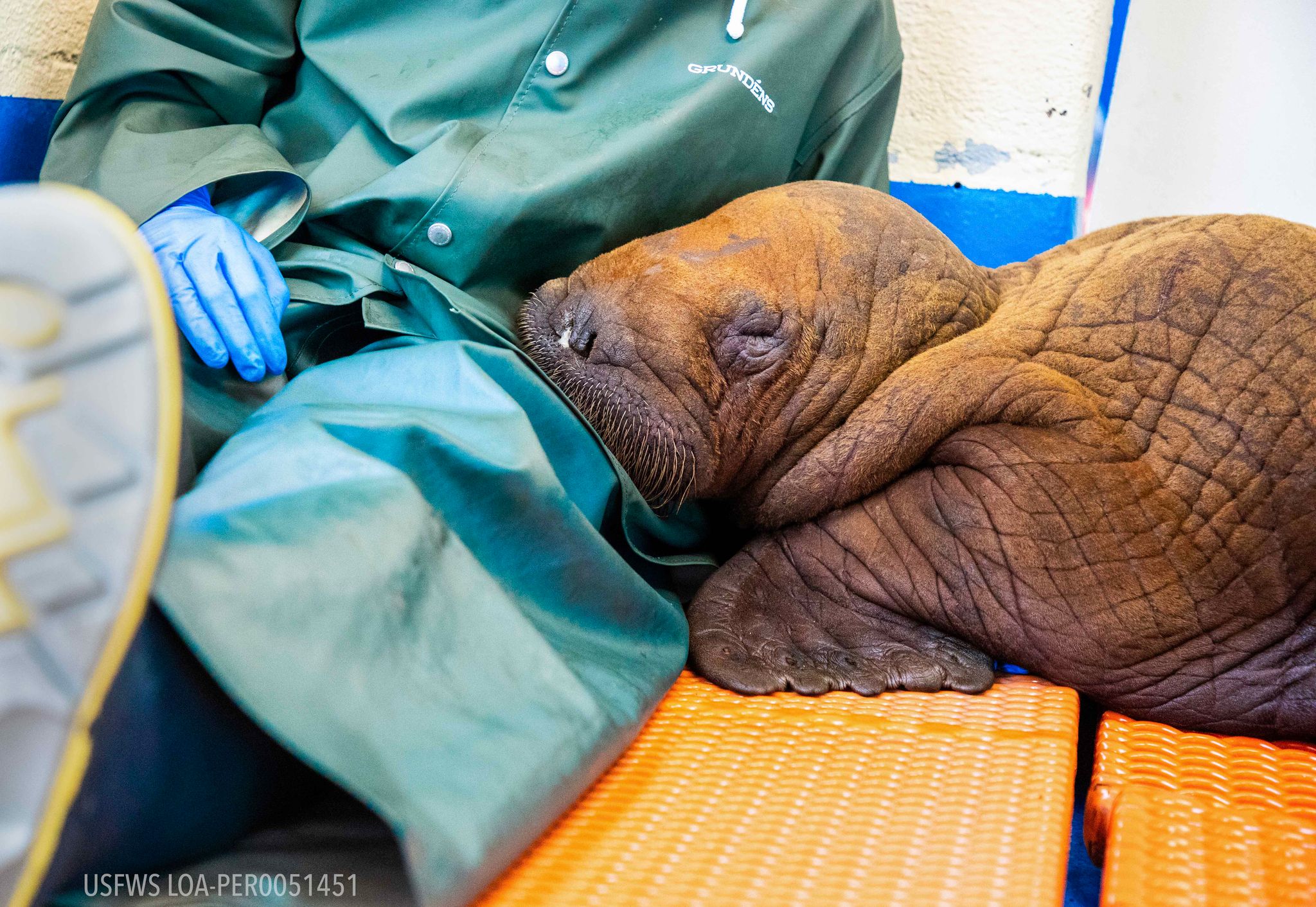 此外,他們還為小海象提供了一個特殊服務——全天候不間斷的擁抱。在過去一週當中,照護人員會輪流坐在小海象身旁,小海象多數時間都在睡覺,當牠睡醒或有需要時,隨時都可以依偎著照護人員。