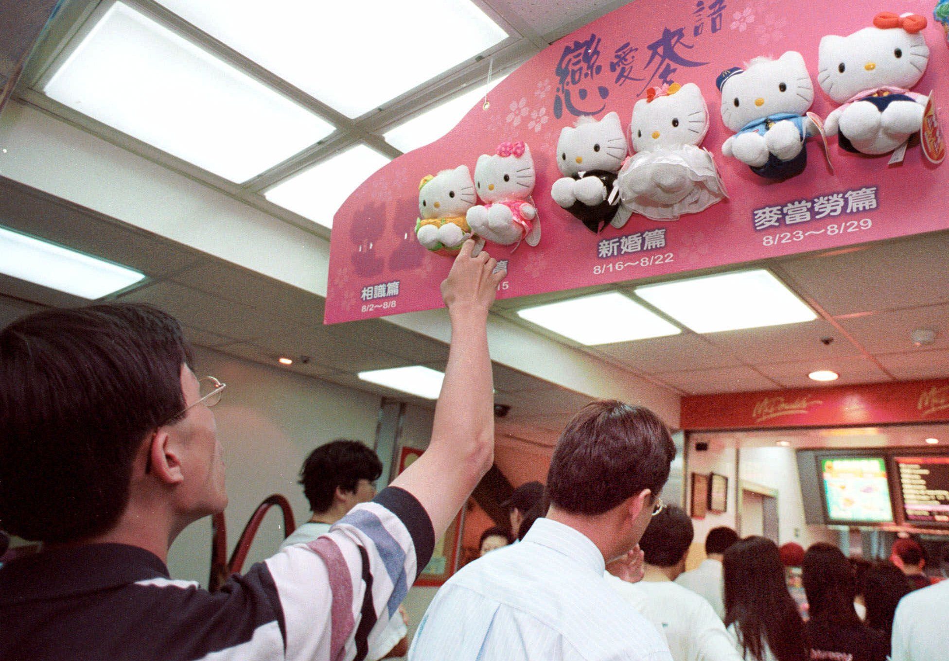 圖為1999年,台灣麥當勞推出的一系列Hello Kitty加價購玩偶,在台灣引爆排隊熱潮。