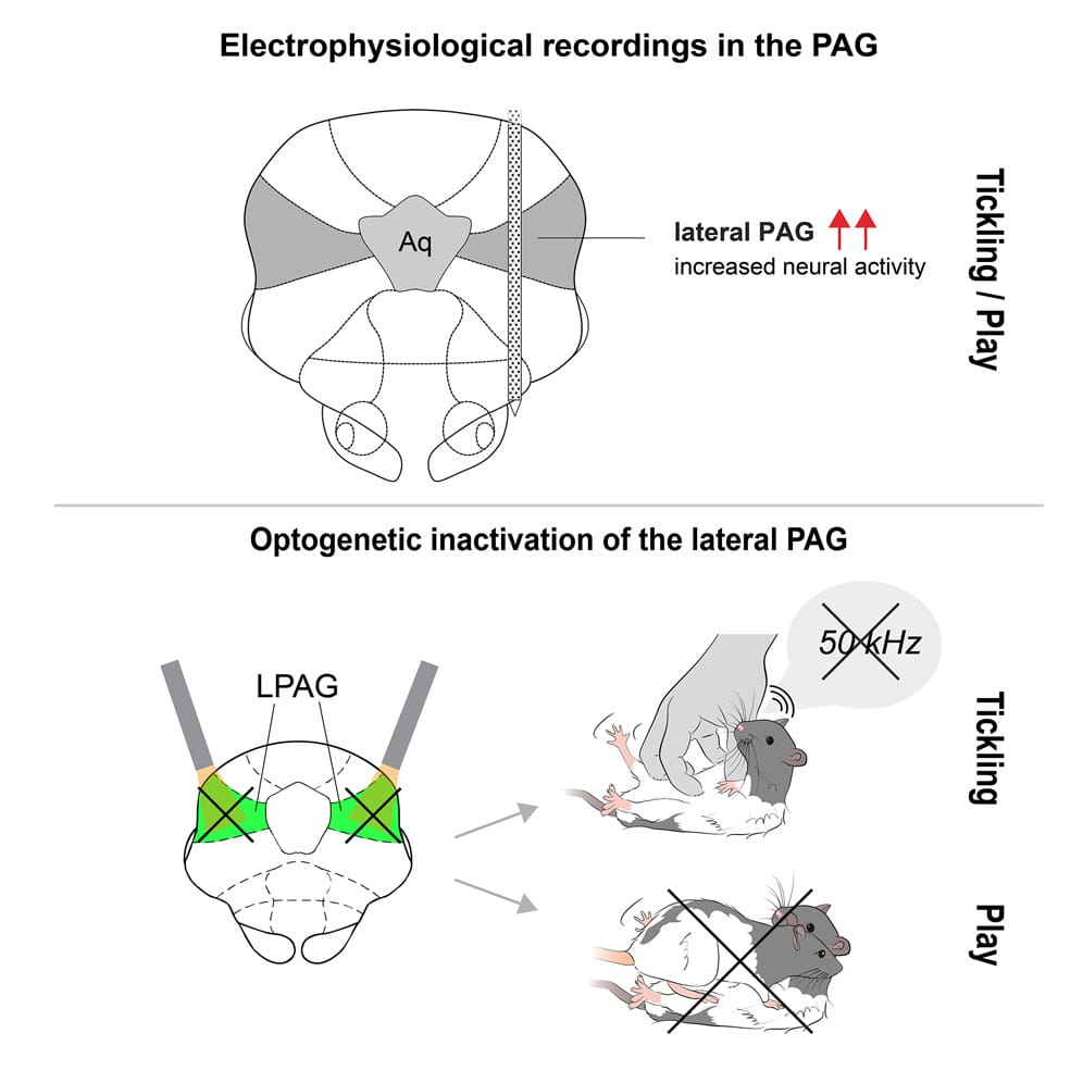 PAG是大腦中負責控制呼吸、調節疼痛的部位,也與動物的戰鬥、逃跑、防衛行為密切相關,且控制了發聲功能。而且,一旦研究人員設法抑制PAG活動,老鼠在搔癢時的尖叫聲會大幅降低,與人類或同伴玩耍的行為也會減少,顯示PAG對於遊戲行為的重要性。
