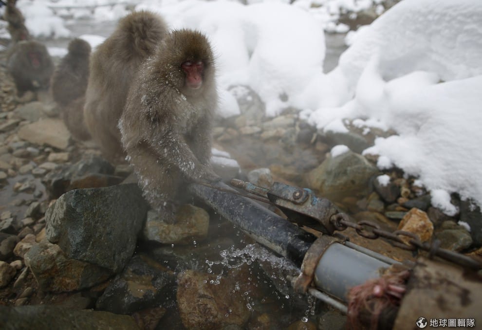 流出溫泉的水管旁也可以見到短尾猴排排站在一塊