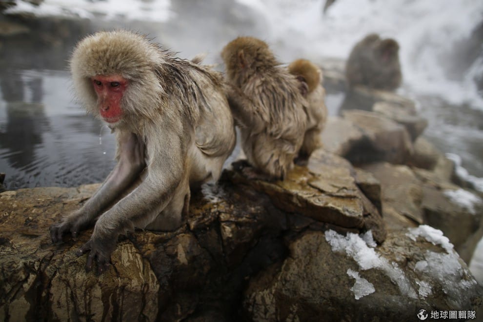 一邊感受溫泉暖意,一邊享受同伴梳毛的短尾猴