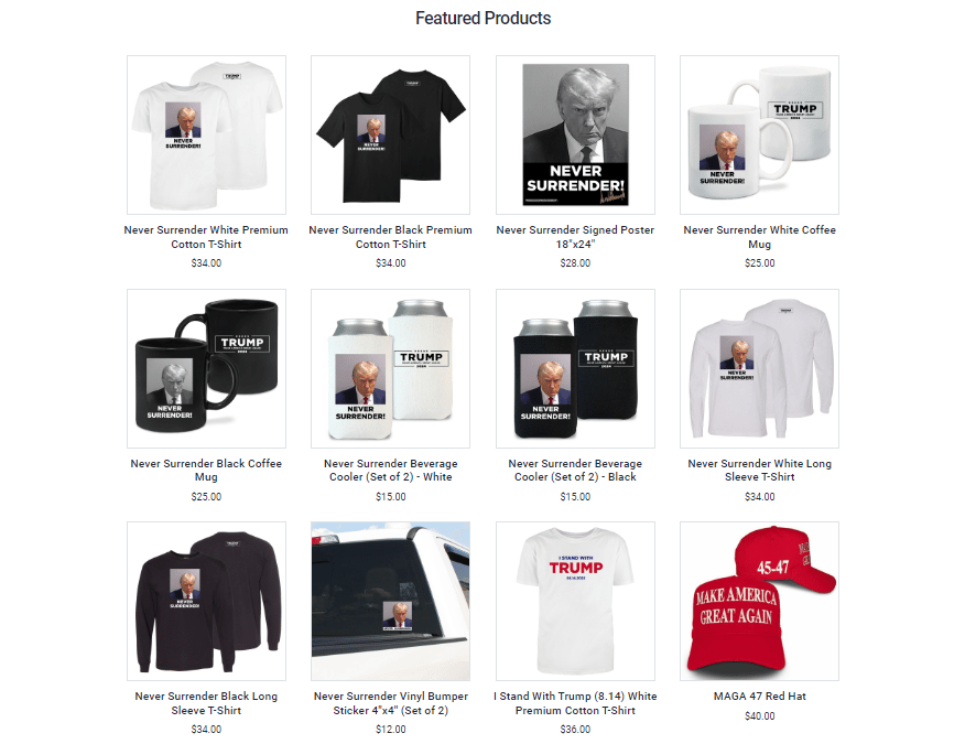 這些募款金額,主要來自與嫌犯大頭照相關的一系列「川普周邊」。週四川普自首的消息傳出後,他的競選團隊立刻利用川普皺眉、瞪視前方的照片,搭配「永不屈服」的文字,製作成T-shirt、海報、馬克杯、保溫杯、貼紙等商品販賣,售價從12~34美元不等。