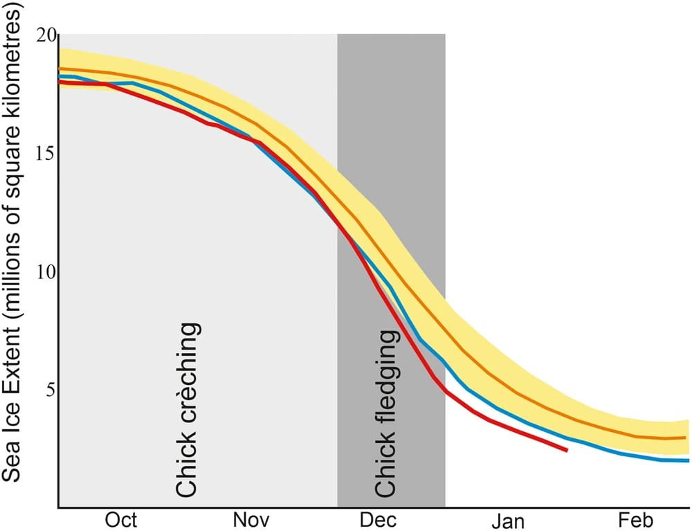 根據科學家監測,自從2016年以來,南極夏季的海冰範圍就急遽下降;在過去的兩個夏季,海冰面積更是創下新低,別林斯高晉海上幾乎沒有冰層覆蓋。目前在科學家已知的企鵝聚落中,已經有三分之一受到海冰範圍縮小影響。
