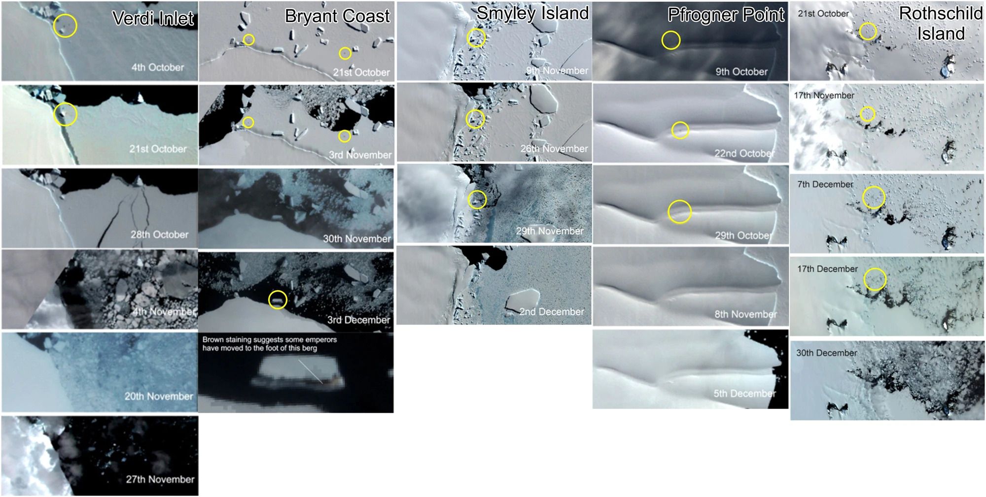 2022年不同時間點,各個企鵝聚落的衛星照片,每一直行為同一個聚落;黃圈處則為可看見企鵝糞便的位置。