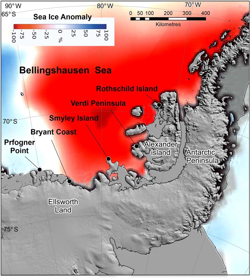 黑點為別林斯高晉海附近5個皇帝企鵝聚落的位置,紅色區域則是海冰異常減少處。