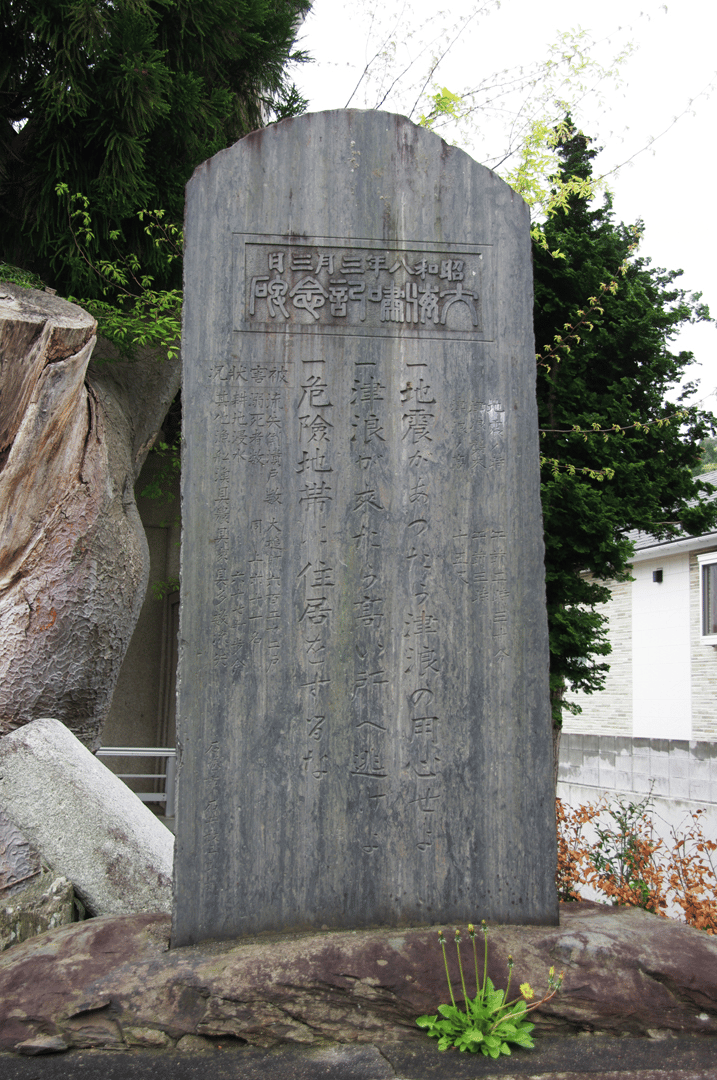 在日本岩手縣姉吉漁港後方山間,有一塊立於1933年昭和三陸地震後的「大海嘯紀念碑」,上面簡短記載明治29年及昭和8年兩次三陸地震海嘯後「部落全滅」的悲慘歷史,以警惕後世子民「不要在此處以下建立家園」。