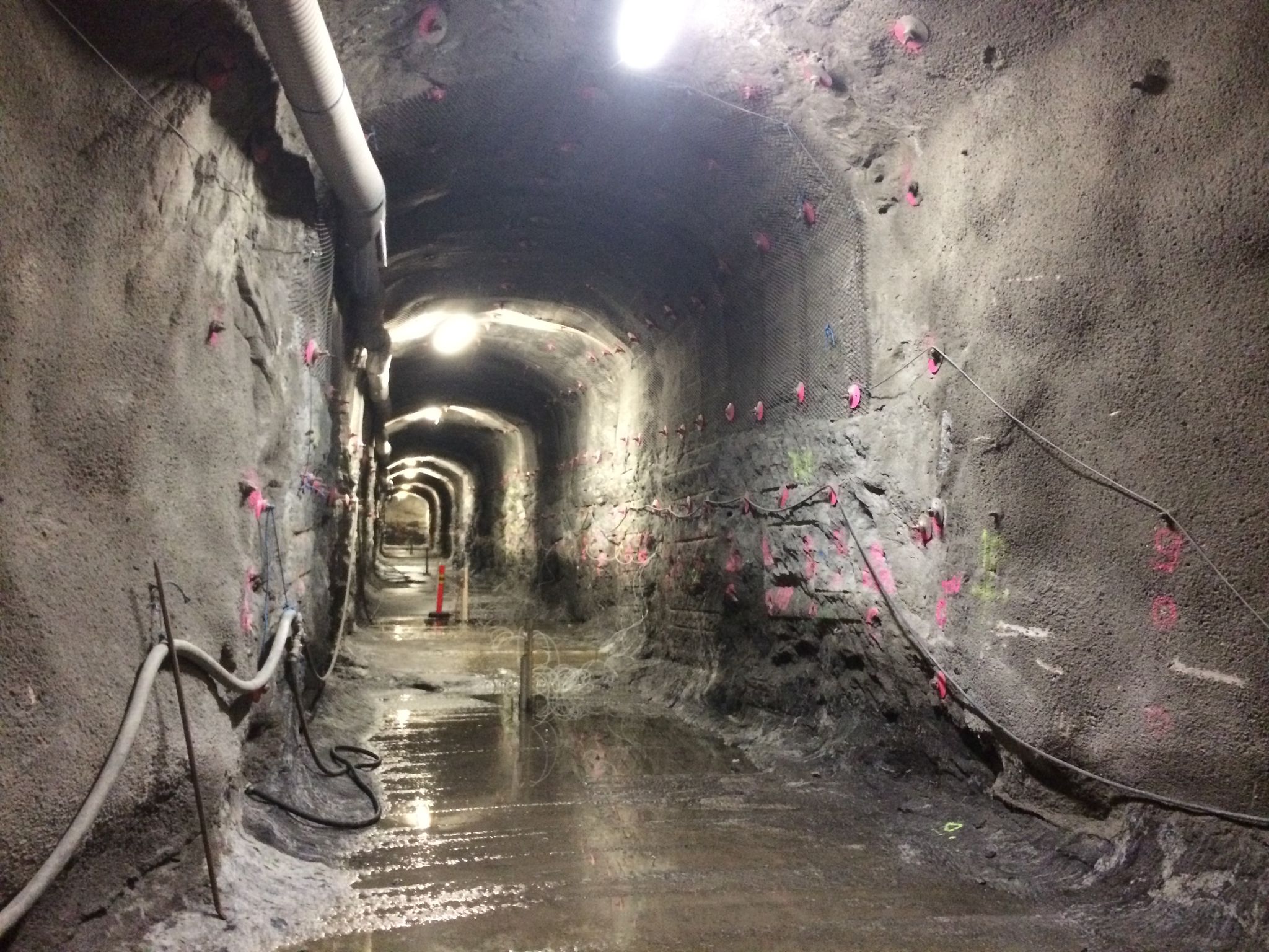 沿著隧道一路往前、向下,隨著岩壁兩側有如高速公路里程牌一般沿途註記目前深度的綠色標示,駛入地底約437公尺的區域,這裡是過去的實驗基地,也是未來,包裹著鑄鐵與核燃料棒的「銅膠囊」從地面一路垂降抵達的第一個暫時安置點。