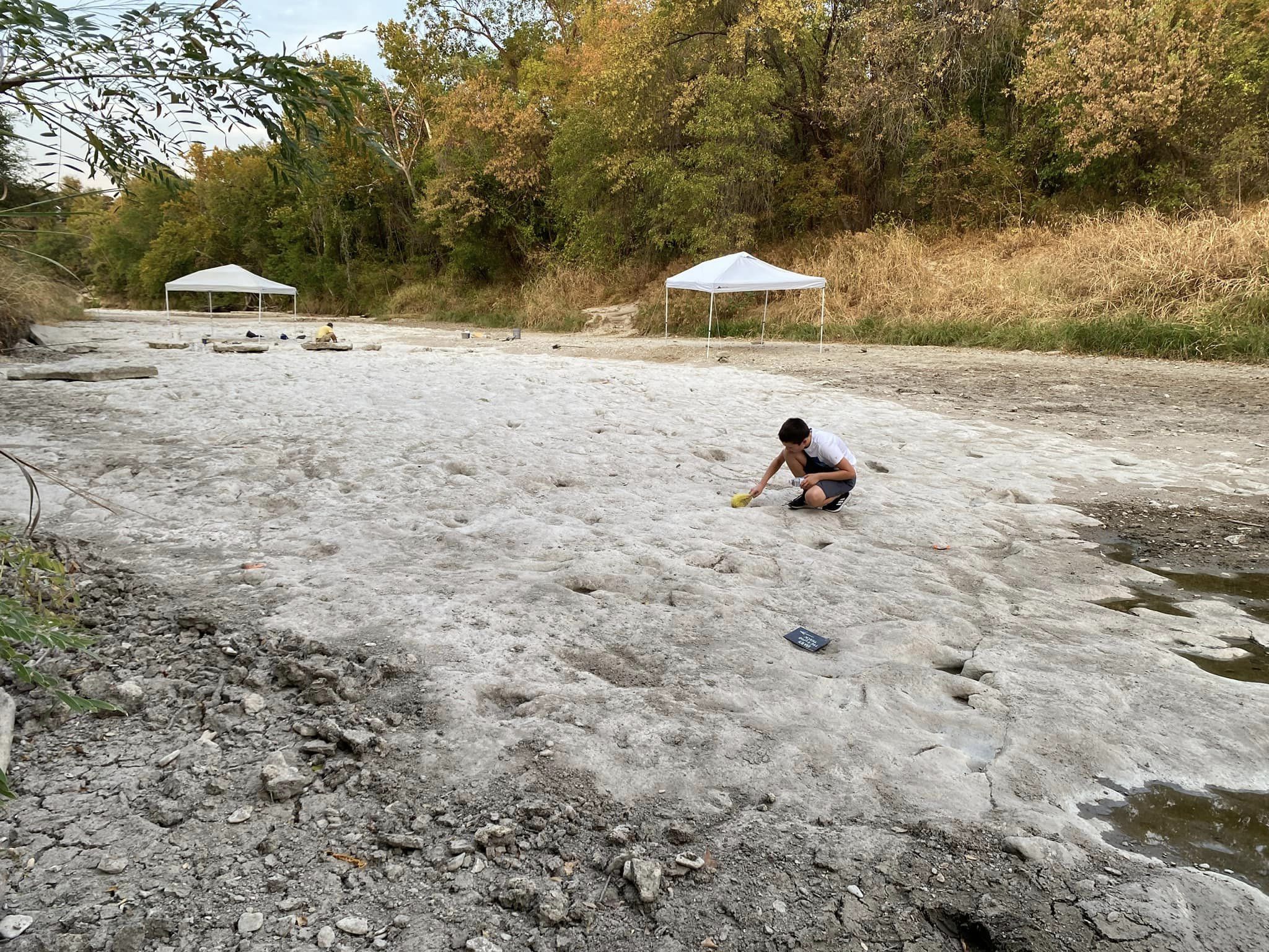 去年和今年,乾旱造成河川水位屢創新低,讓許多珍貴的足跡被看見。恐龍谷州立公園的工作人員趁著這個機會,帶領志工、研究人員,清理與繪製新發現的恐龍足跡。
