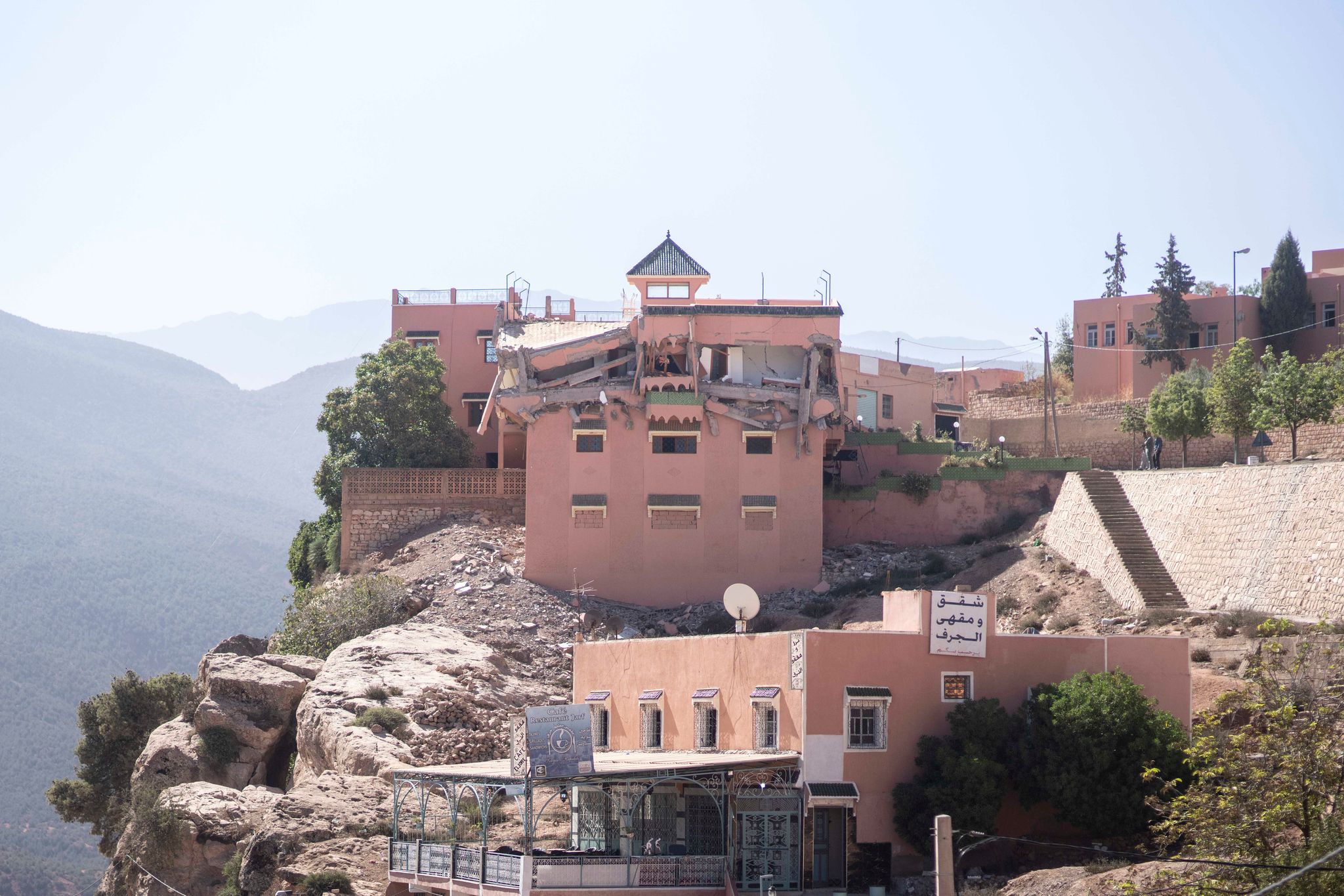 馬拉喀什附近的一個村落中,一間旅館建築受損嚴重。