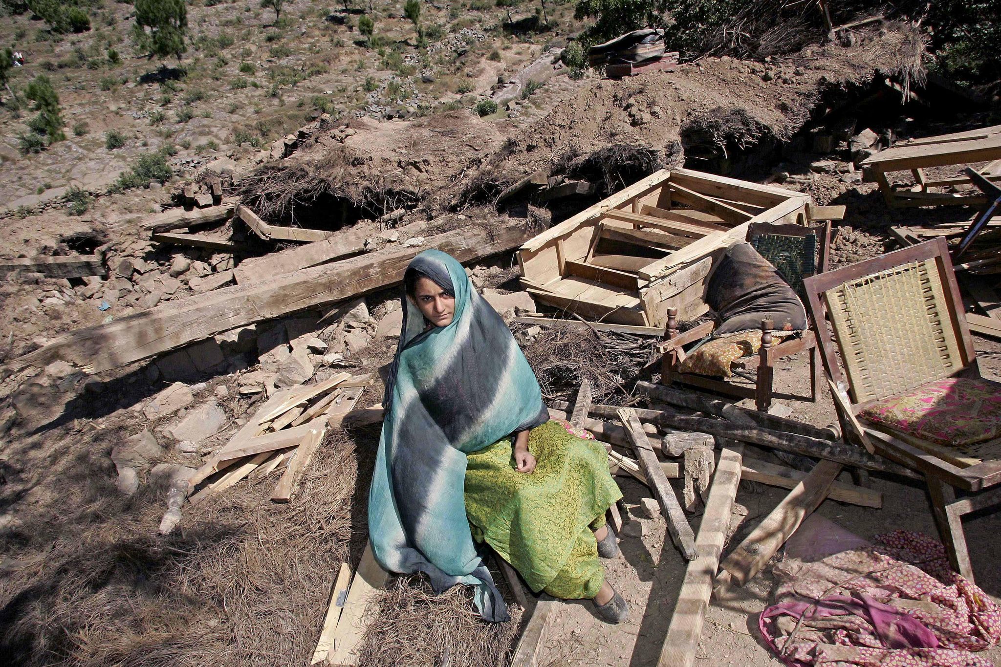 路透社 / 達志影像null一名喀什米爾地震的倖存者,坐在遭震毀的房屋旁等待救援。