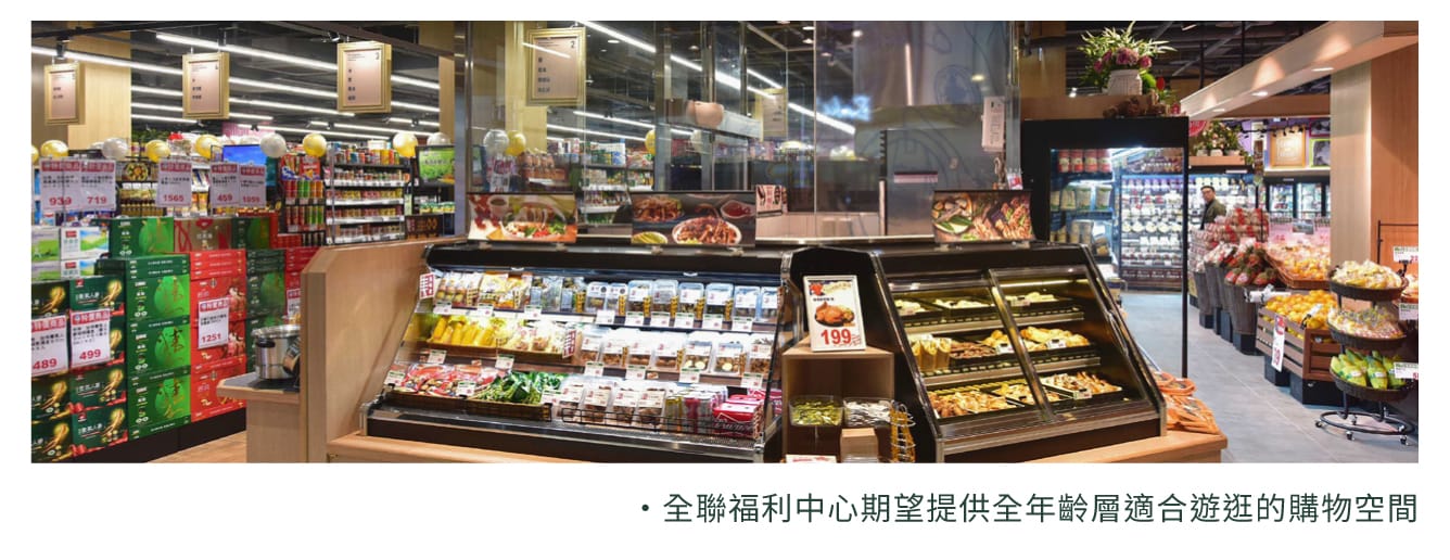 去戶外,則有全聯專為高齡人口設計的《銀髮超市》概念店。在消費面,量身打造適合長者的購物空間,包括層架排列、走道寬度、標籤字大小以及更齊全的營養食品提供挑選。在就業面,建立銀髮族就業機制和資深員工榮譽榜。