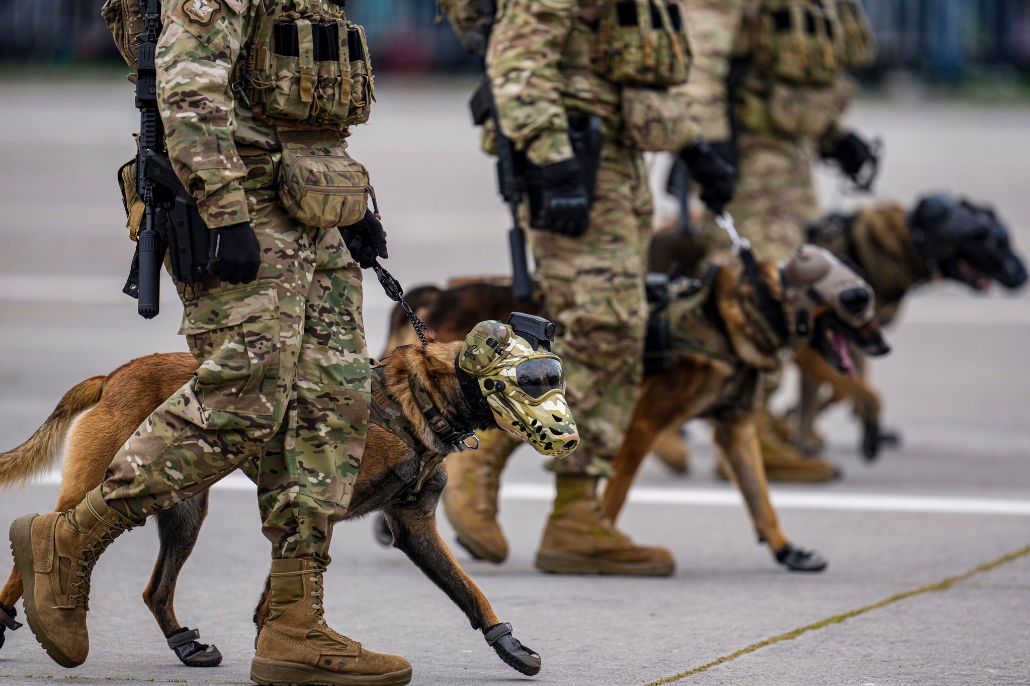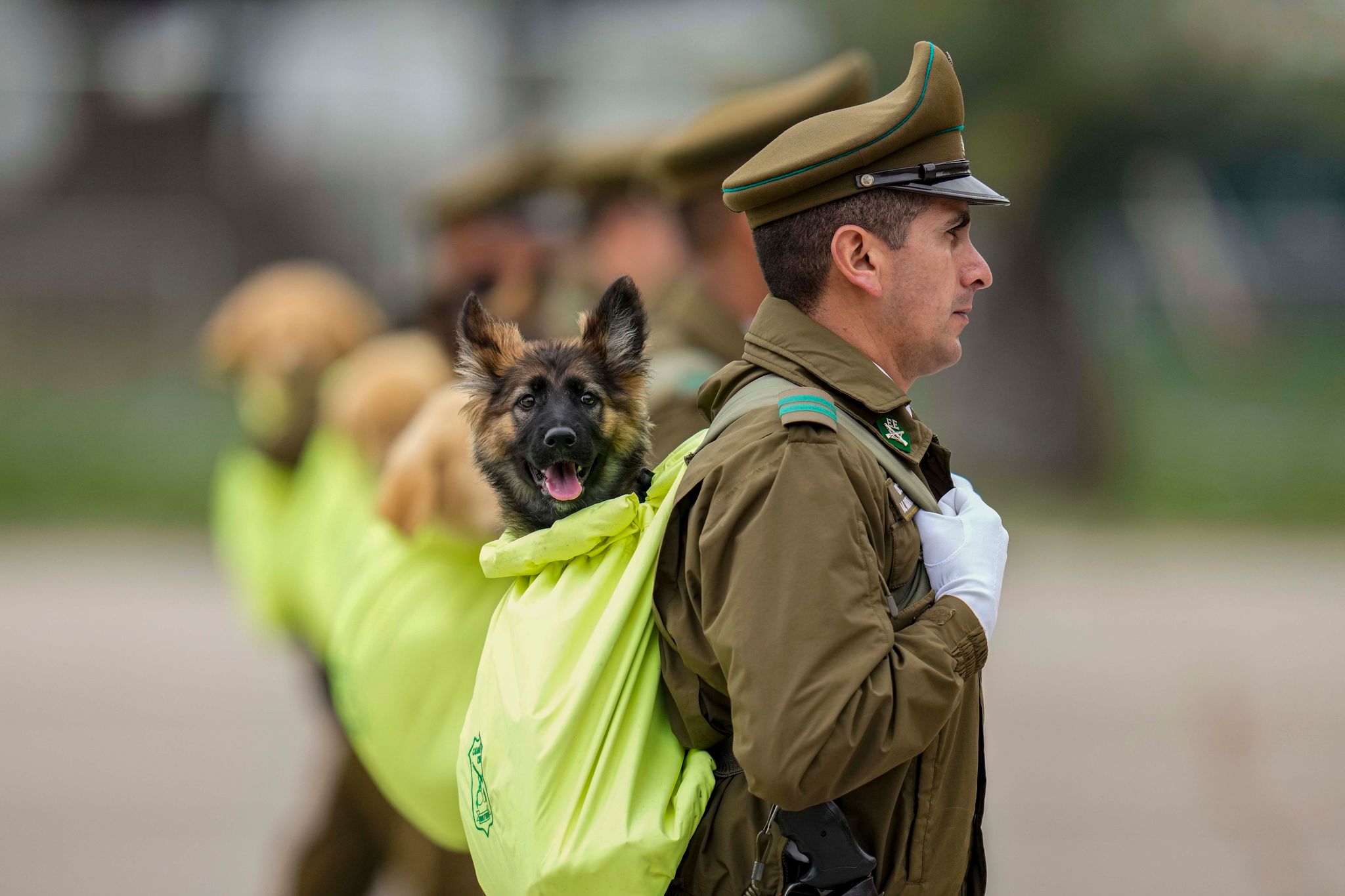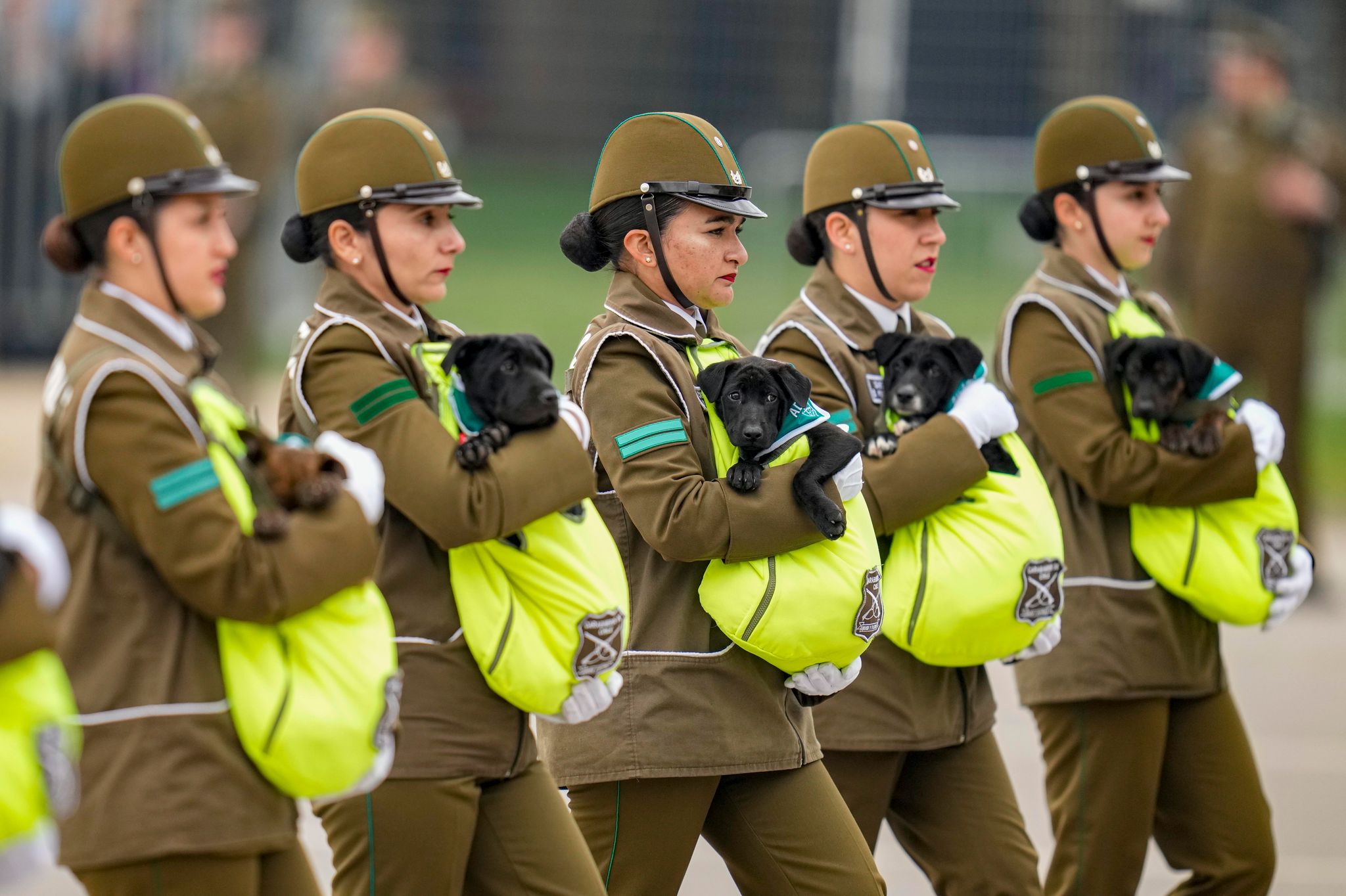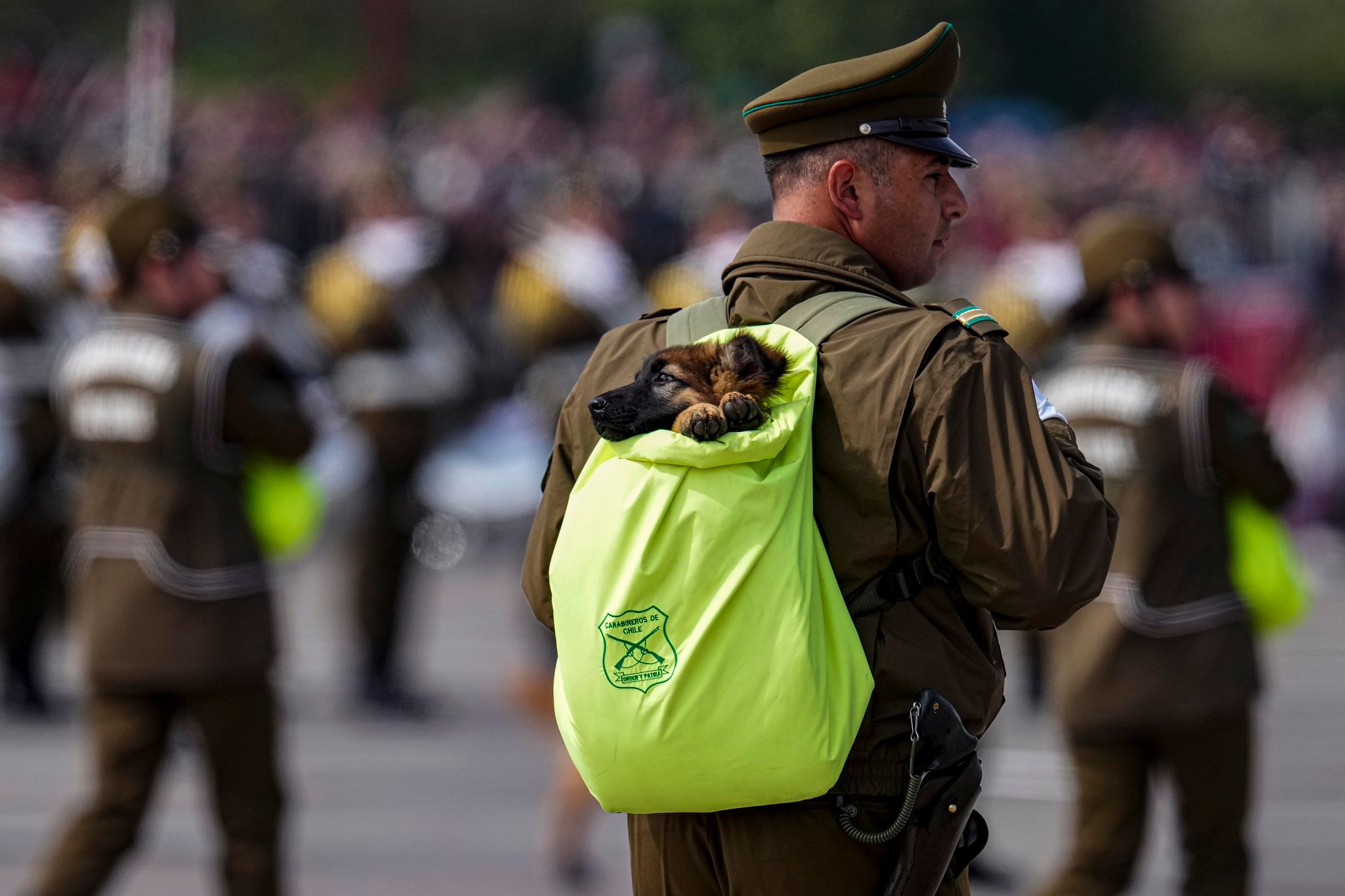 智利的軍犬們自2017年在獨立紀念日的閱兵典禮中首次亮相,此後每年都是典禮中的「超級明星」。這些參與遊行的軍犬年紀不一,有些幼犬被軍人抱在懷裡、背在身上,只從螢光黃的背袋中露出一顆頭;成犬則會跟著部隊一起邁步。