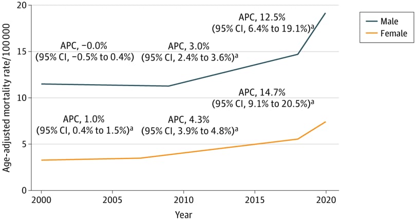 圖為1999~2020 年美國酒精相關死亡率(依性別)的趨勢圖。
