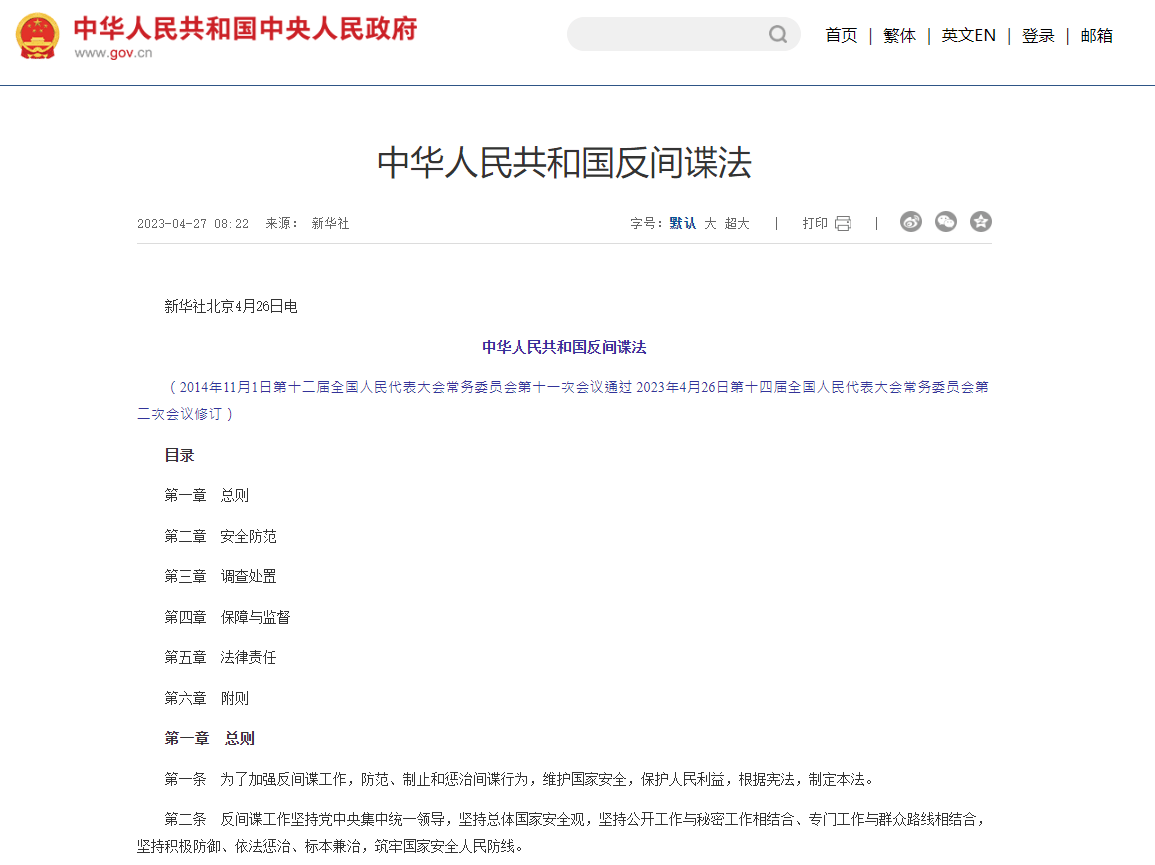 今年上半年,中國曾三番兩次以竊取機密資料、接觸涉密人員為理由,突襲美國企業在北京、上海等地辦公室,拘捕任職其中的中國公民;七月起實施的「反間諜法」,不僅擴大間諜行為定義,包括「針對國家機關、涉密單位或者關鍵資訊基礎設施等的網路攻擊、侵入、干擾、控制、破壞等活動」、「竊取、刺探、收買、非法提供國家秘密、情報以及其他關係國家安全和利益的文件、數據、資料、物品」等定義不清、界定模糊和詮釋權過大的規範,也讓中國國安人員,可以更加恣意妄為地展開調查,不管對象是被他們認為有間諜意圖的外國人,甚至是未有積極實際作為以協助國家防止間諜活動的中國人。