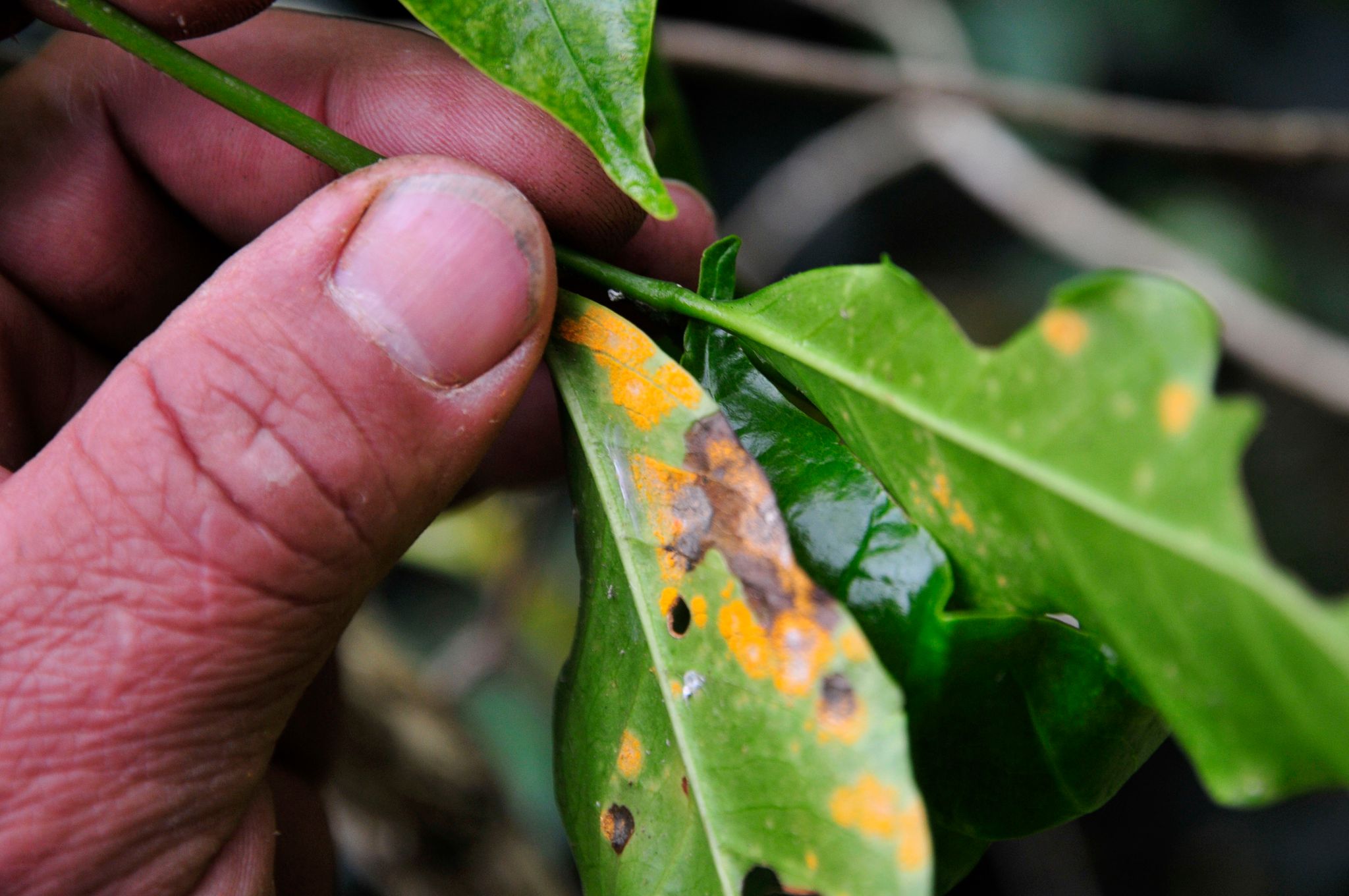葉鏽病對咖啡農而言,可能是最恐怖的噩夢。當咖啡樹染上這種疾病,樹葉會開始產生棕色的細粉,彷彿鐵鏽一般,原本明亮的綠色葉片,也會逐漸褪為棕黃色;最後,咖啡樹得所有葉片都會脫落,再也無法長出咖啡豆。