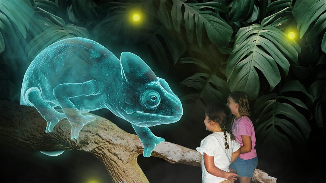 當遊客進入動物園,必須戴上特殊的眼鏡,才能看見立體影像。這種眼鏡與一般3D電影的眼鏡不同,投影機器能夠追蹤眼鏡位置,根據每個人所處的方位不同,為每雙眼睛生成獨特的視角。也就是說,如果你繞著虛擬動物走動,就能看見動物不同角度的樣貌,而且動物仍然留在原地,彷彿真實存在於空間中。