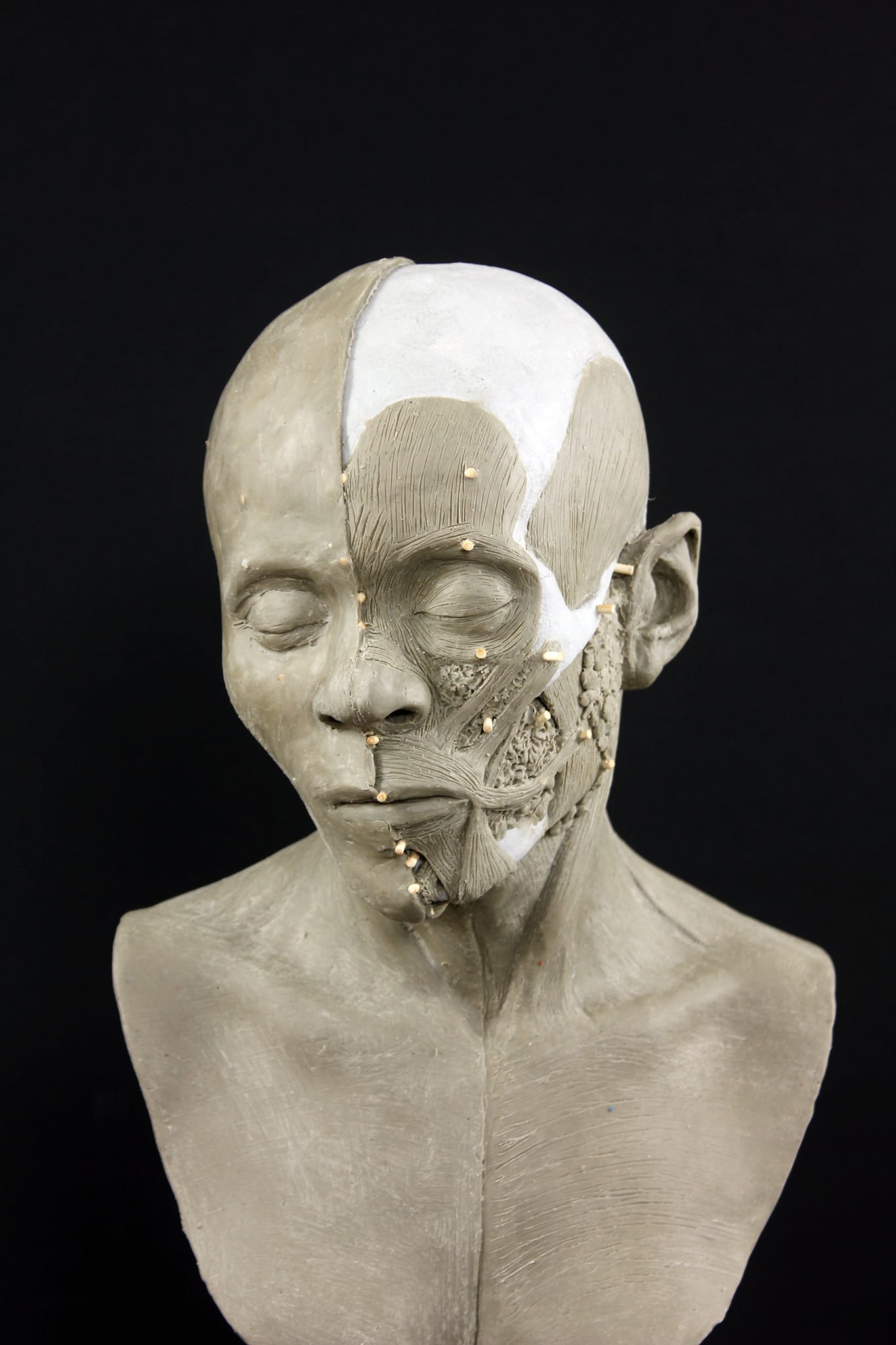 尼爾森先利用黏土、木釘雕琢面部肌肉,隨後再加上矽膠外皮與毛髮。圖為尼爾森的其他作品,並非胡安妮塔。