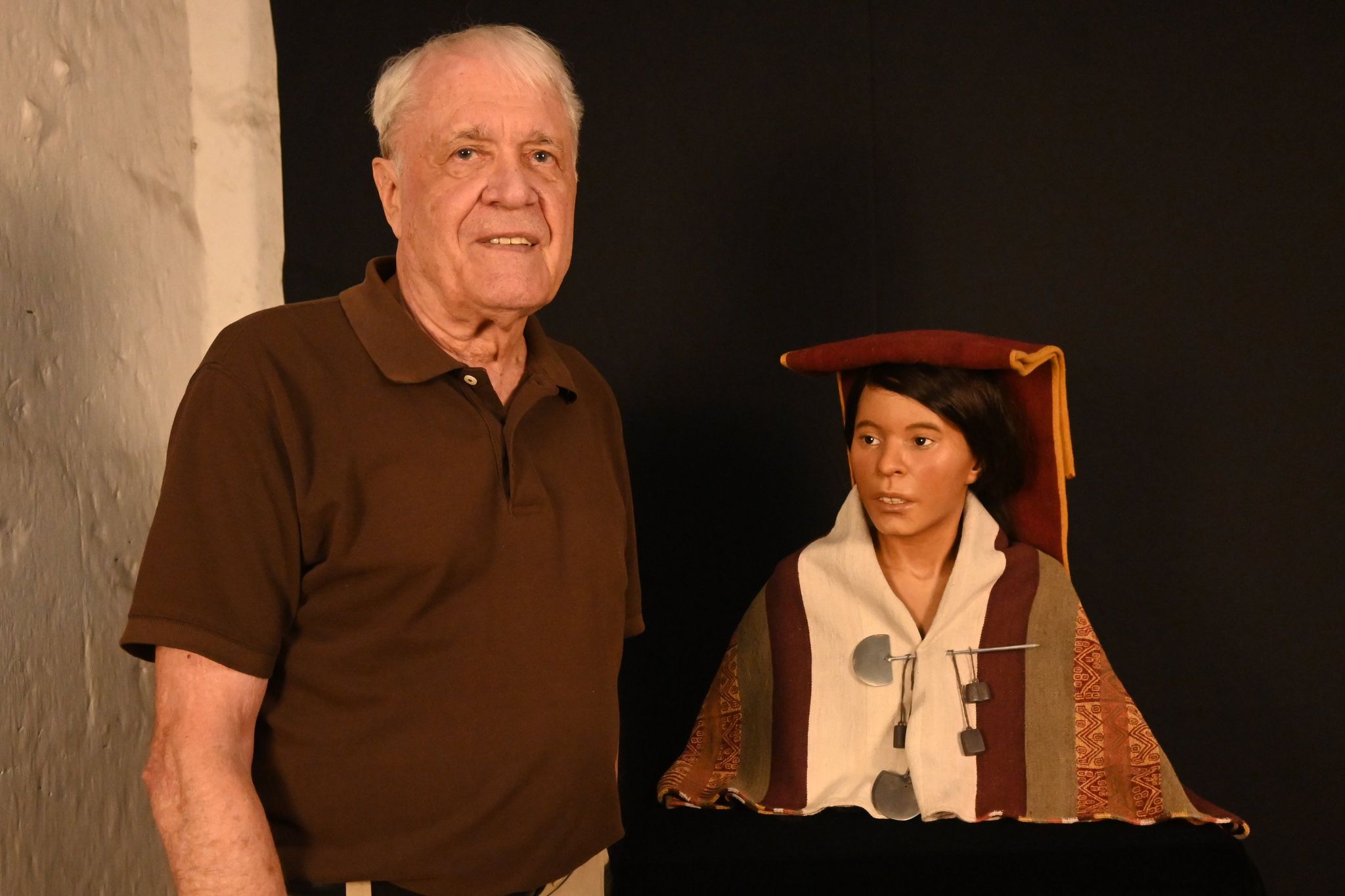 28年前發現木乃伊的萊因哈特,與胡安妮塔的半身像合照。