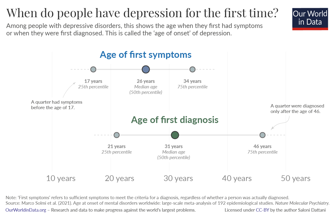 一篇2021年的研究顯示,憂鬱症患者第一次有症狀的年齡中位數為26歲,第一次被診斷的年齡中位數則為31歲。