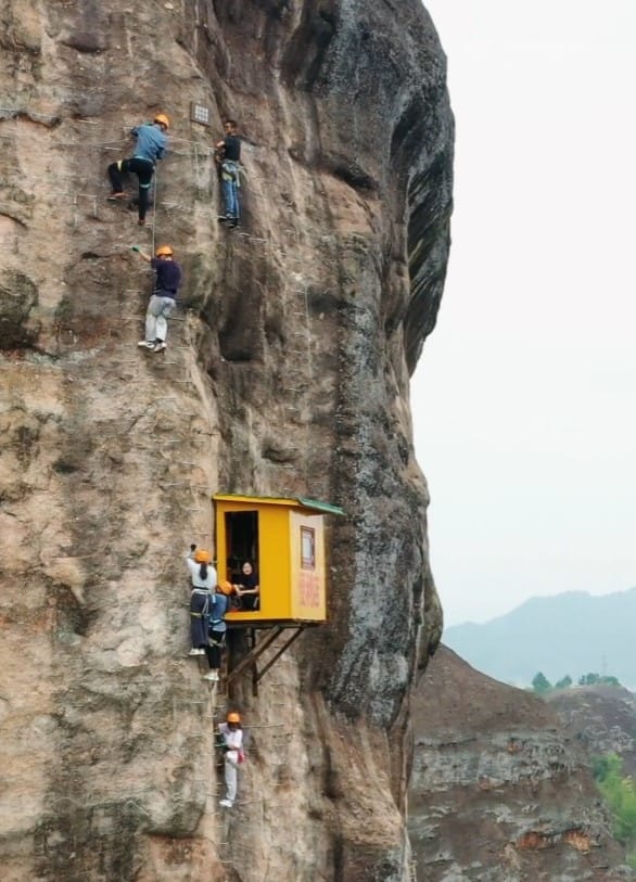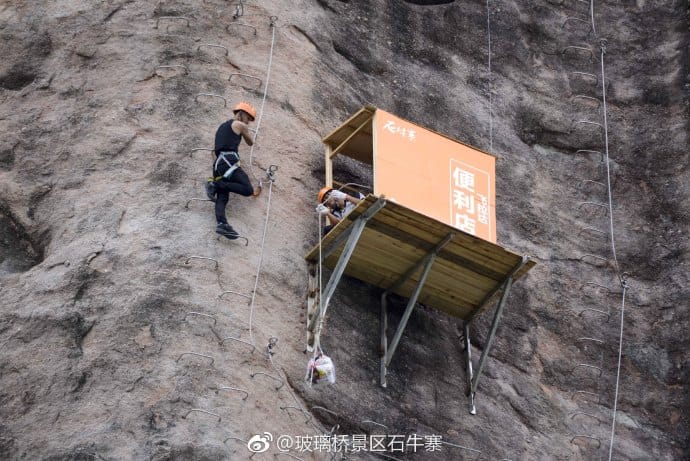 網友岳陽平江石牛寨景區微博2018年,景區為了提供攀岩著們補給品,突發奇想地決定在峭壁上開一間便利商店。店鋪距離地面120公尺,位於3條攀岩路線的交會點,當民眾藉由繩索、鐵製橫梯抵達半空,就能夠免費向店家取得一瓶水,或購買各種飲料、補給品,有需要者還能在店裡稍作休息。