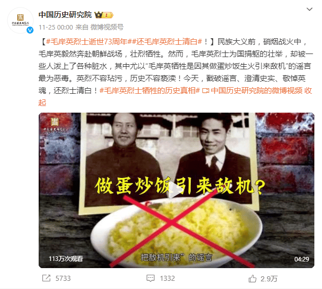 對此,中國歷史研究院於25日,還發布一支名為「毛岸英烈士逝世73週年,還毛岸英烈士清白」的短片,聲稱毛岸英為國捐軀的壯舉,被有心人士潑了各種髒水,其中尤以「毛岸英犧牲是因其做蛋炒飯生火引來敵機」的謠言最為惡毒。影片提到,製做蛋炒飯的說法不符合歷史現實,並強調「今天,戳破謠言、澄清史實、敬悼英魂,還烈士清白!」