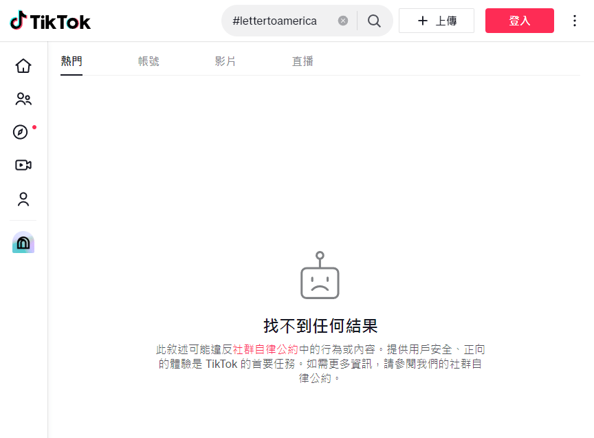 目前,如果在TikTok上搜尋「Osama bin Laden」、「bin Laden letter」、「osama letter」,或是標籤「#lettertoamerica」,皆會顯示「找不到任何結果」。