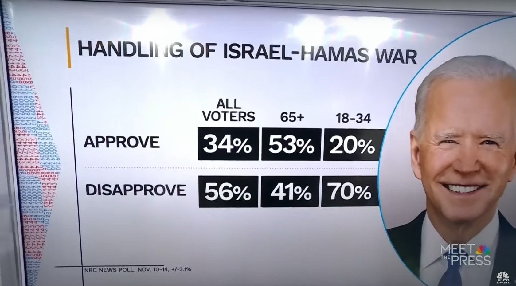 《NBC新聞》經民調發現,18至34歲的美國青年中,有70%不滿拜登在此次以哈戰爭中的處理方式。圖/截自NBC News YouTube