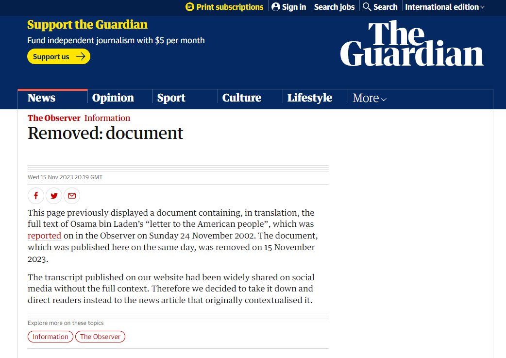 《衛報》發言人馬特(Matt Mittenthal)指出:「我們2002年在網站上發布的信件內容,在社群媒體上被廣泛分享,但是該篇文章並未提供完整的上下文。」因此,他們決定刪除文章,並將讀者引導至標題為〈奧薩瑪發出新的戰爭號令〉(Osama issues new call to arms)的新聞,希望民眾完整理解事件的前因後果。