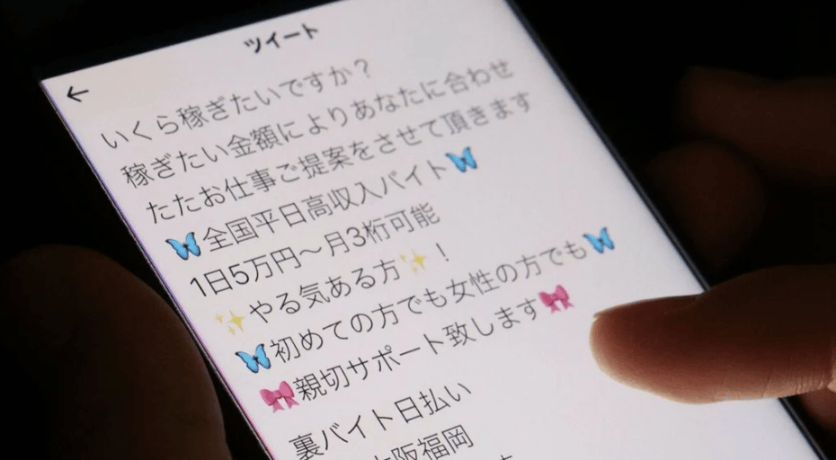 根據就職網站mynavi最新的調查,會使用社群媒體找打工的高中生佔50%、大學生佔30.8%,其中,針對因特殊詐欺而被抓的犯人,高達46.8%的人是使用Twitter應徵暗黑打工,其中九成是男性、30歲以下的年輕人佔最大宗44.6%、犯罪動機有七成多為缺錢或是想要賺錢。