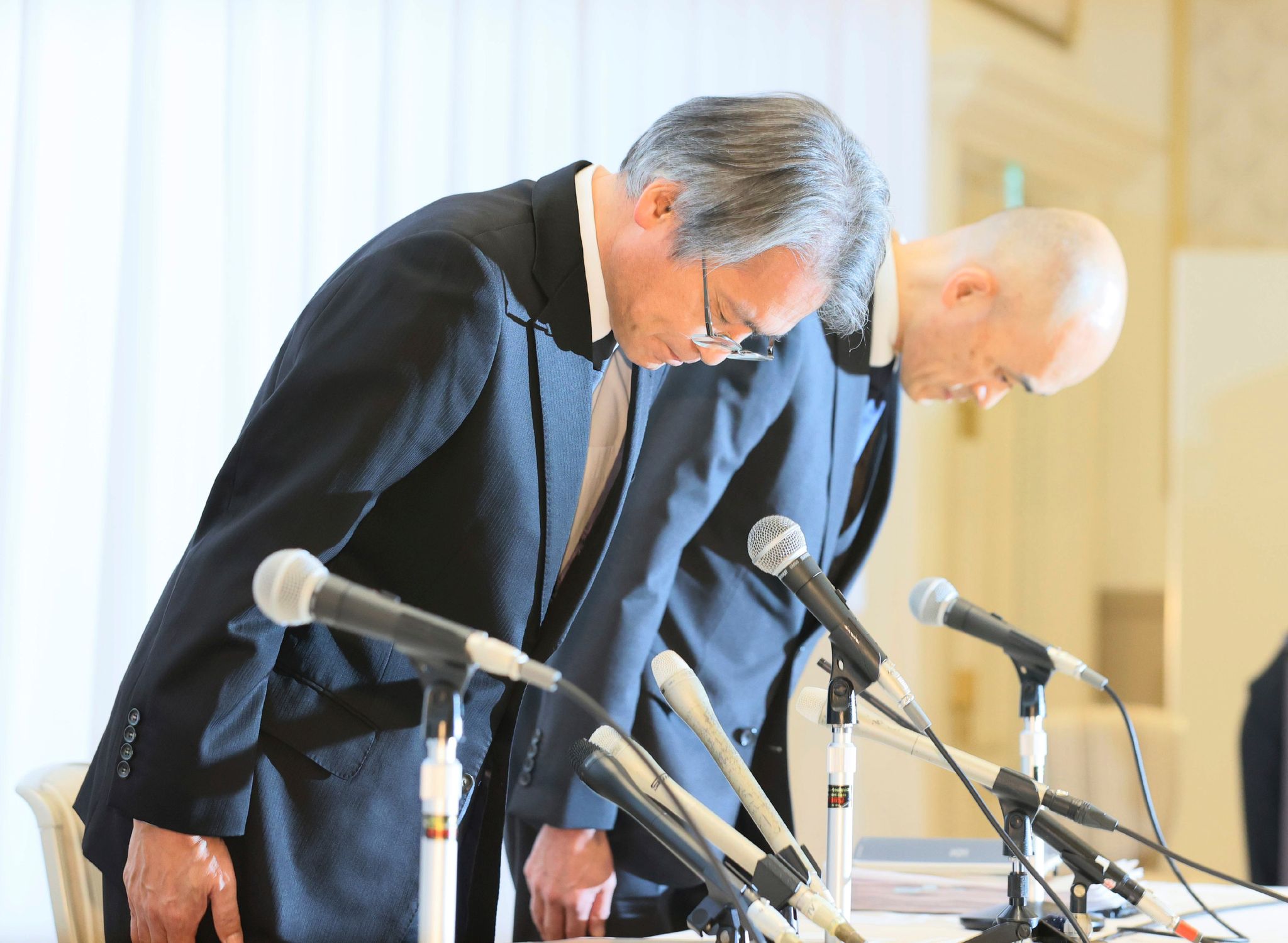 圖為11月14日,寶塚歌劇團理事長木場健之在記者會上鞠躬道歉。