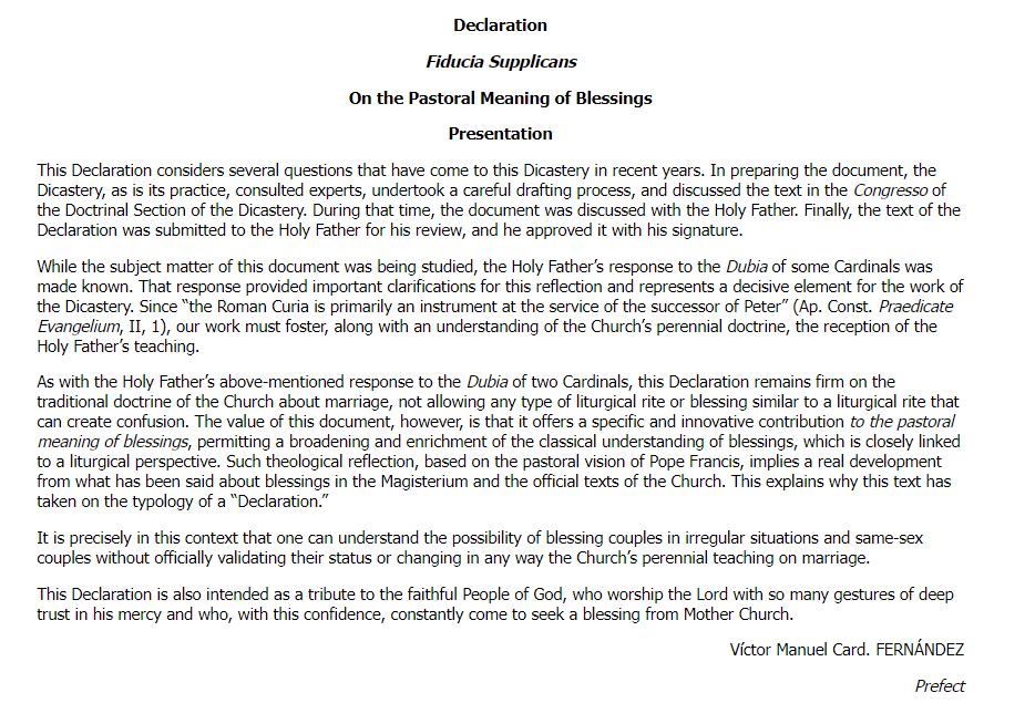 斐迪南在文件開頭的宣言中提到,羅馬天主教會對「婚姻」的傳統教義保持堅定立場,不允許任何可能引起混淆的禮儀或儀式。然而,他希望能夠擴展天主教中的「祝福」,接納任何有需要且前來尋求的人,藉由這份文件「對祝福的牧養意義提供具體而創新的貢獻」。