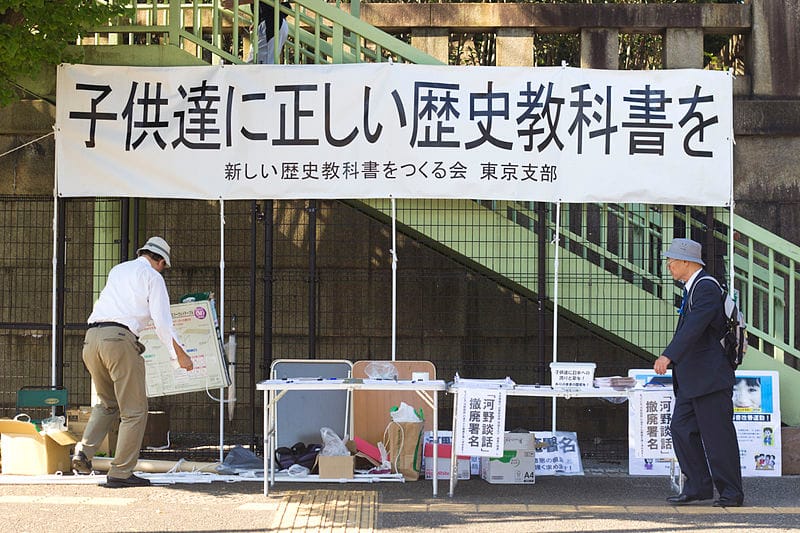 圖為2014年,新歷史教科書製作協會在靖國神社前掛起標語「請給孩子提供正確史觀的歷史教科書」,要求日本政府撤廢,1992年內閣官房長官河野洋平,對於日軍強徵韓國慰安婦表達反省與道歉的「河野談話」。