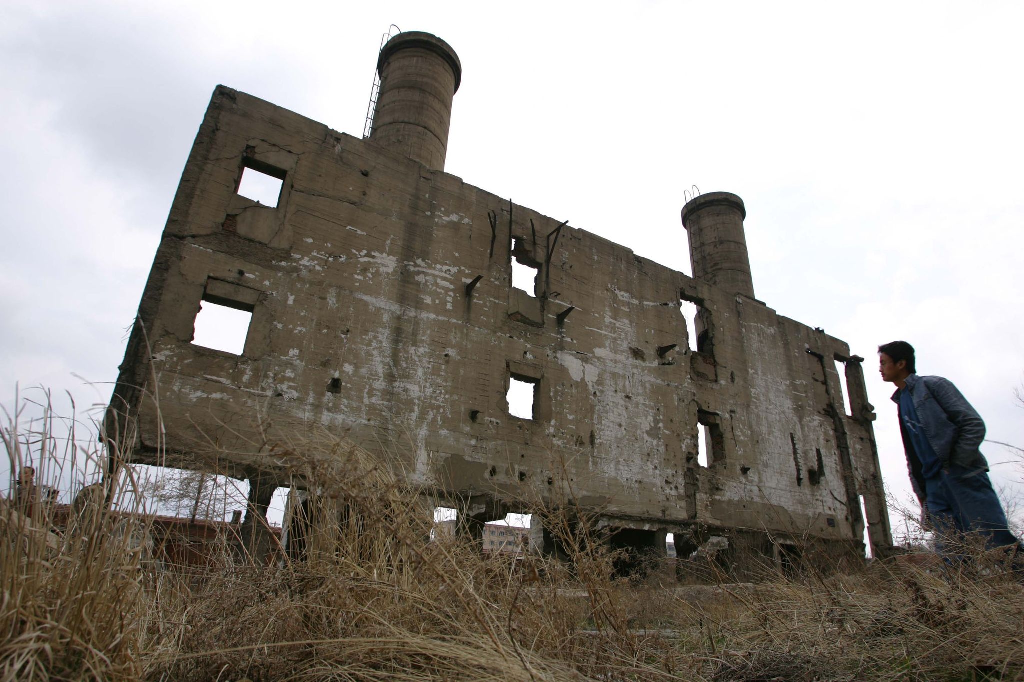 圖為一名男子站在中國東北,位於哈爾濱的日本細菌戰中心的一棟廢墟前。