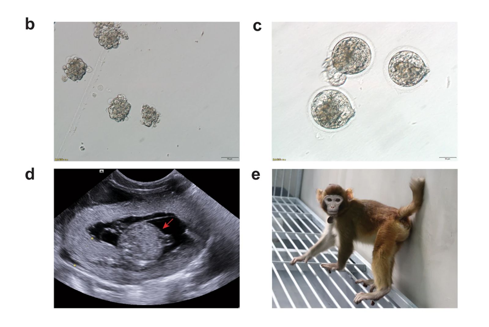 實驗過程中培育的胚胎細胞,胚胎在母猴腹中的樣貌,以及ReTro 17個月大時的照片。