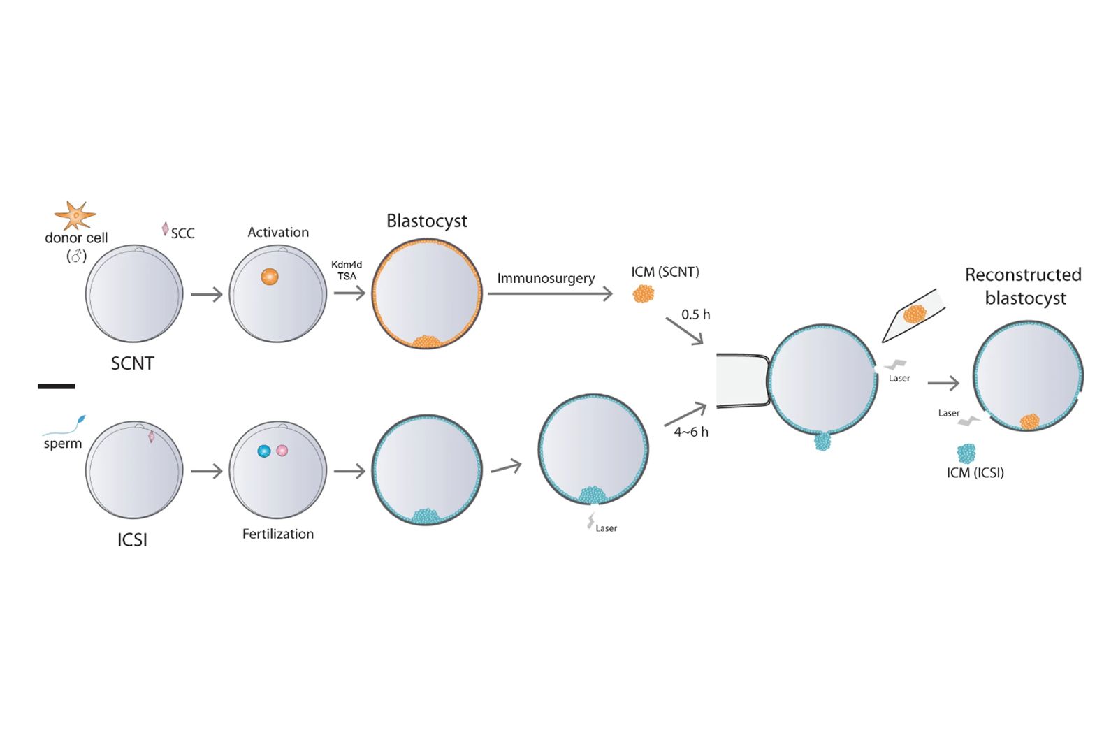 研究團隊將SCNT複製胚胎的內部細胞,移植到一般胚胎內,讓胚胎能發育出健康的胎盤。