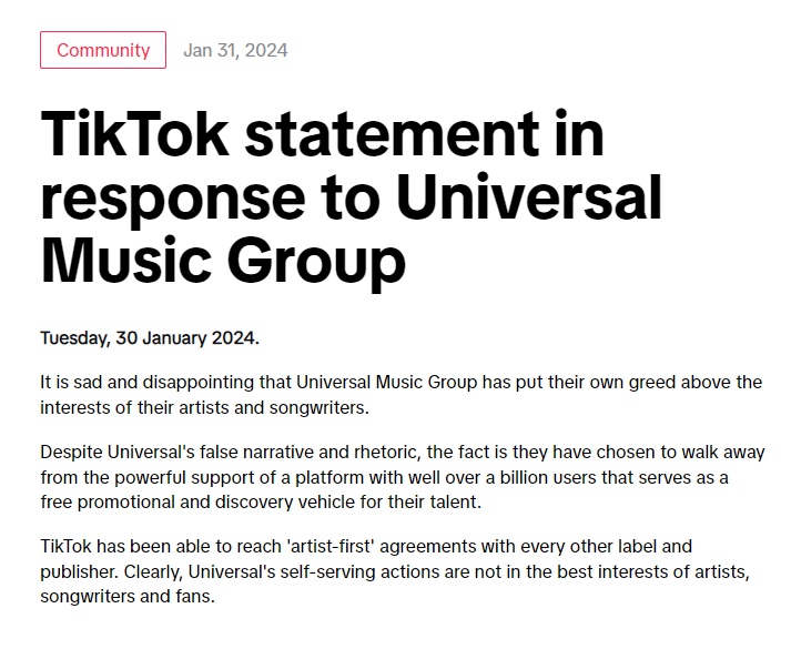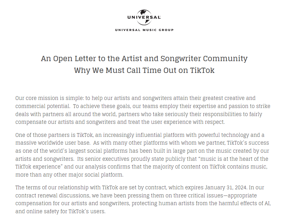 環球音樂在聲明中表示,TikTok的成功就是建基於音樂,平台高層也曾說過「音樂是TikTok體驗的核心」,卻又不願意支付合理的價格。