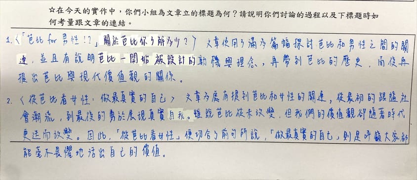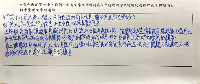 主軸就是要能讓讀者意識到芭比娃娃和女性有連結。第一個標題是希望讀者能在標題就知道芭比和女性自我認同這兩者有關係,而後面的問句是為了吸引那些知道芭比而又不太了解的讀者。