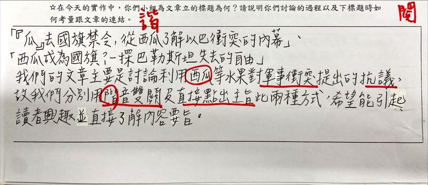 地球圖輯隊null文章主要是討論利用西瓜等水果對軍事衝突提出的抗議,故我們分別用諧音雙關及直接點出主旨此兩種方式,希望能引起讀者興趣並直接了解內容要旨。